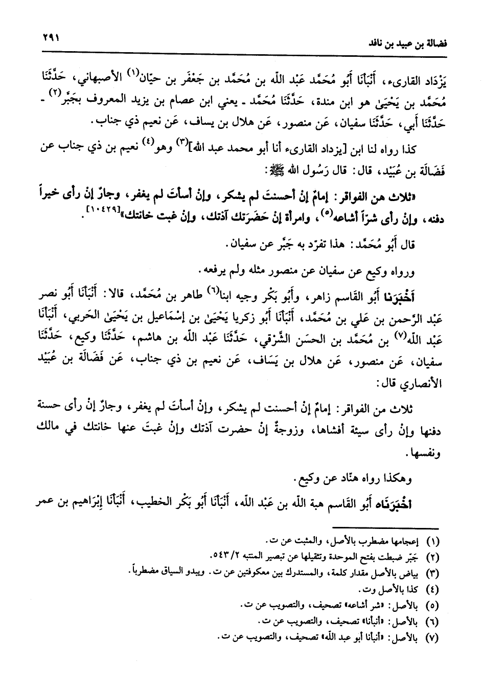 يزداد القارئ أنبأنا أبو محمد عبد الله بن محمد بن جعفر بن حيان (1) الأصبهاني حدثنا محمد بن يحيى هو ابن مندة حدثنا محمد يعني ابن عصام بن يزيد المعروف بجبر (2) حدثنا أبي حدثنا سفيان عن منصور عن هلال بن يساف عن نعيم ذي جناب كذا رواه لنا ابن يزداد القارئ أنا أبو محمد عبد الله (3) وهو (4) نعيم بن ذي جناب عن فضالة بن عبيد قال قال رسول الله (صلى الله عليه وسلم) ثلاث هن الفواقر إمام إن أحسنت لم يشكر وإن أسأت لم يغفر وجار إن رأى خيرا دفنه وإن رأى شرا أشاعه (5) وامرأة إن حضرتك آذتك وإن غبت خانتك قال أبو محمد هذا تفرد به جبر بن سفيان ورواه وكيع عن سفيان عن منصور مثله ولم يرفعه أخبرنا أبو القاسم زاهر وأبو بكر وجيه ابنا (6) طاهر بن محمد قالا أنبأنا أبو نصر عبد الرحمن بن علي بن محمد أنبأنا أبو زكريا يحيى بن إسماعيل بن يحيى الحربي أنبأنا عبد الله (7) بن محمد بن الحسن الشرقي حدثنا عبد الله بن هاشم حدثنا وكيع حدثنا سفيان عن منصور عن هلال بن يساف عن نعيم بن ذي جناب عن فضالة بن عبيد الأنصاري قال ثلاث من الفواقر إمام إن أحسنت لم يشكر وإن أسأت لم يغفر وجار إن رأى حسنة دفنها وإن رأى سيئة أفشاها وزوجة إن حضرت آذتك وإن غبت عنها خانتك في مالك ونفسها وهكذا رواه هناد عن وكيع أخبرناه أبو القاسم هبة الله بن عبد الله أنبأنا أبو بكر الخطيب أنبأنا إبراهيم بن عمر