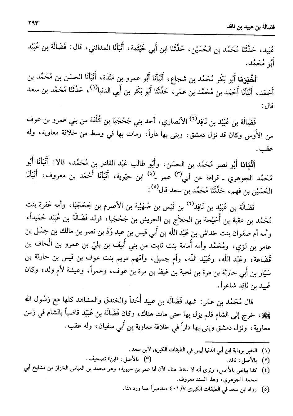عبيد حدثنا محمد بن الحسين حدثنا ابن أبي خيثمة أنبأنا المدائني قال فضالة بن عبيد أبو محمد أخبرنا أبو بكر محمد بن شجاع أنبأنا أبو عمرو بن مندة أنبأنا الحسن بن محمد بن أحمد أنبأنا أحمد بن محمد بن عمر حدثنا أبو بكر بن أبي الدنيا (1) حدثنا محمد بن سعد قال فضالة بن عبيد بن نافد (2) الأنصاري أحد بني جحجبا بن كلفة من بني عمرو بن عوف من الأوس وكان قد نزل دمشق وبنى بها دارا ومات بها في وسط من خلافة معاوية وله عقب أنبأنا أبو نصر محمد بن الحسن وأبو طالب عبد القادر بن محمد قالا أنبأنا أبو محمد الجوهري قراءة عن أبي (3) عمر (4) ابن حيوية أنبأنا أحمد بن معروف أنبأنا الحسين بن فهم حدثنا محمد بن سعد قال (5) فضالة بن عبيد بن نافد (2) بن قيس بن صهيبة بن الأصرم بن جحجبا وأمه عفرة بنت محمد بن عقبة بن احيحة بن الحلاج بن الحريش بن جحجبا فولد فضالة بن عبيد حميدا وأمه أم صفوان بنت خداش بن عبد الله بن أبي قيس بن عبد ود بن نصر بن مالك بن حسل بن عامر بن لؤي ومحمد وأمه أمامة بنت ثابت من بني أنيف بن بلي بن عمرو بن الحاف بن قضاعة وعبد الله وعبيد الله وأم جميل وأمهم مريم بنت عوف بن قيس بن حارثة بن سيار بن أبي حارثة بن مرة بن نحبة بن غيظ بن مرة بن عوف وعمرا وعيشة لأم ولد وكان عبيد بن نافد شاعرا قال محمد بن عمر شهد فضالة بن عبيد أحدا والخندق والمشاهد كلها مع رسول الله (صلى الله عليه وسلم) خرج إلى الشام فلم يزل بها حتى مات هناك وكان فضالة بن عبيد قاضيا بالشام في زمن معاوية ونزل دمشق وبنى بها دارا في خلافة معاوية بن أبي سفيان وله عقب