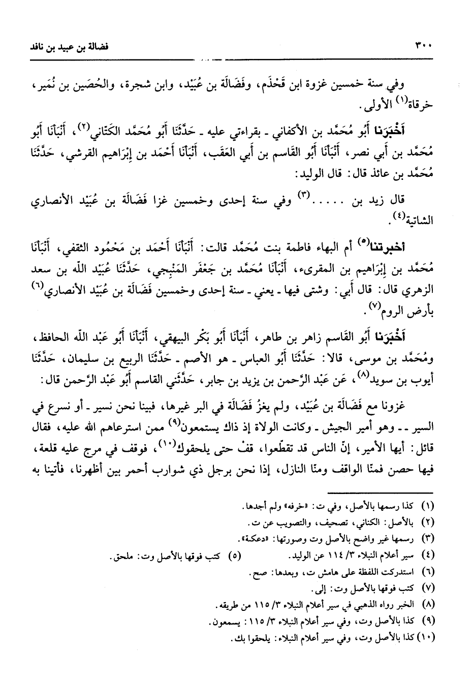 وفي سنة خمسين غزوة ابن قحذم وفضالة بن عبيد وابن شجرة والحصين بن نمير خرقاة (1) الأولى أخبرنا أبو محمد بن الأكفاني بقراءتي عليه حدثنا أبو محمد الكتاني (2) أنبأنا أبو محمد بن أبي نصر أنبأنا أبو القاسم بن أبي العقب أنبأنا أحمد بن إبراهيم القرشي حدثنا محمد بن عائذ قال قال الوليد قال زيد بن (3) وفي سنة إحدى وخمسين غزا فضالة بن عبيد الأنصاري الشاتية (4) أخبرتنا (5) أم البهاء فاطمة بنت محمد قالت أنبأنا أحمد بن محمود الثقفي أنبأنا محمد بن إبراهيم بن المقرئ أنبأنا محمد بن جعفر المنبجي حدثنا عبيد الله بن سعد الزهري قال قال أبي وشتى فيها يعني سنة إحدى وخمسين فضالة بن عبيد الأنصاري (6) بأرض الروم (7) أخبرنا أبو القاسم زاهر بن طاهر أنبأنا أبو بكر البيهقي أنبأنا أبو عبد الله الحافظ ومحمد بن موسى قالا حدثنا أبو العباس هو الأصم حدثنا الربيع بن سليمان حدثنا أيوب بن سويد (8) عن عبد الرحمن بن يزيد بن جابر حدثني القاسم أبو عبد الرحمن قال غزونا مع فضالة بن عبيد ولم يغز فضالة في البر غيرها فبينا نحن نسير أو نسرع في السير وهو أمير الجيش وكانت الولاة إذ ذاك يستمعون (9) ممن استرعاهم الله عليه فقال قائل أيها الأميرإن الناس قد تقطعوا قف حتى يلحقوك (10) فوقف في مرج عليه قلعة فيها حصن فمنا الواقف ومنا النازل إذا نحن برجل ذي شوارب أحمر بين أظهرنا فأتينا به