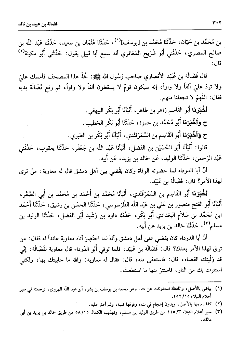 بن محمد بن حيان حدثنا محمد بن يوسف (1) حدثنا عثمان بن سعيد حدثنا عبد الله بن صالح المصري حدثني أبو شريح المعافري أنه سمع أبا قبيل يقول حدثني أبو مكينة (2) قال قال فضالة بن عبيد الأنصاري صاحب رسول الله (صلى الله عليه وسلم) خذ هذا المصحف فأمسك علي ولا ترد علي ألفا ولا واوا إنه سيكون قوم لا يسقطون ألفا ولا واوا ثم رفع فضالة يديه فقال اللهم لا تجعلنا منهم أخبرنا أبو القاسم زاهر بن طاهر أنبأنا أبو بكر البيهقي ح وأخبرنا أبو محمد بن حمزة حدثنا أبو بكر الخطيب ح وأخبرنا أبو القاسم بن السمرقندي أنبأنا أبو بكر بن الطبري قالوا أنبأنا الحسين بن الفضل أنبأنا عبد الله بن جعفر حدثنا يعقوب حدثني عبد الرحمن حدثنا الوليد عن خالد بن يزيد عن أبيه أن أبا الدرداء لما حضرته الوفاة وكان يقضي بين أهل دمشق قال له معاوية من ترى لهذا الأمر قال فضالة بن عبيد أخبرنا أبو القاسم بن السمرقندي أنبأنا محمد بن أحمد بن محمد بن أبي الصقر أنبأنا أبو الفتح منصور بن علي بن عبد الله الطرسوسي حدثنا الحسن بن رشيق حدثنا أحمد ابن محمد بن سلام البغدادي أبو بكر حدثنا داود بن رشيد أبو الفضل حدثنا الوليد بن مسلم (3) حدثنا خالد بن يزيد عن أبيه أن أبا الدرداء كان يقضي على أهل دمشق وأنه لما احتضر أتاه معاوية عائدا له فقال من ترى لهذا الأمر بعدك قال فضالة بن عبيد فلما توفي أبو الدرداء قال معاوية لفضالة إني قد وليتك القضاء قال فاستعفي منه قال فقال له معاوية والله ما حابيتك بها ولكني استترت بك من النار فاستتر منها ما استطعت