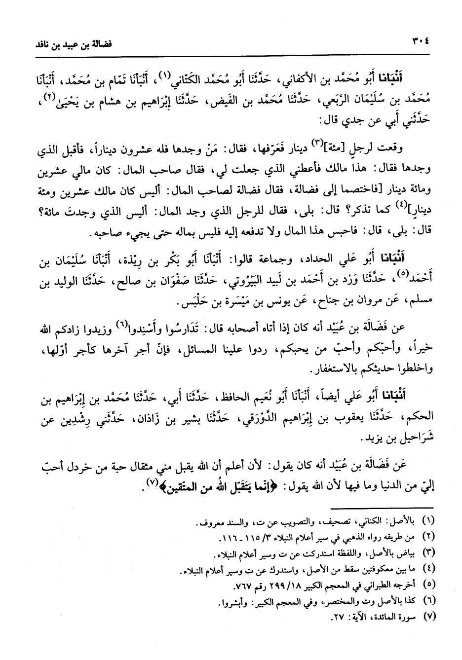 أنبأنا أبو محمد بن الأكفاني حدثنا أبو محمد الكتاني (1) أنبأنا تمام بن محمد أنبأنا محمد بن سليمان الربعي حدثنا محمد بن الفيض حدثنا إبراهيم بن هشام بن يحيى (2) حدثني أبي عن جدي قال وقعت لرجل مئة (3) دينار فعرفها فقال من وجدها فله عشرون دينارا فأقبل الذي وجدها فقال هذا مالك فأعطني الذي جعلت لي فقال صاحب المال كان مالي عشرين ومائة دينار فاختصما إلى فضالة فقال فضالة لصاحب المال أليس كان مالك عشرين ومئة دينار (4) كما تذكر قال بلى فقال للرجل الذي وجد المال أليس الذي وجدت مائة قال بلى قال فاحبس هذا المال ولا تدفعه إليه فليس بماله حتى يجئ صاحبه أنبأنا أبو علي الحداد وجماعة قالوا أنبأنا أبو بكر بن ريذة أنبأنا سليمان بن أحمد حدثنا ورد بن أحمد بن لبيد البيروتي حدثنا صفوان بن صالح حدثنا الوليد بن مسلم عن مروان بن جناح عن يونس بن ميسرة بن حلبس عن فضالة بن عبيد أنه كان إذا أتاه أصحابه قال تدارسوا وأسندوا (6) وزيدوا زادكم الله خيرا وأحبكم وأحب من يحبكم ردوا علينا المسائل فإن أجر آخرها كأجر أولها واخلطوا حديثكم بالاستغفار أنبأنا أبو علي أيضا أنبأنا أبو نعيم الحافظ حدثنا أبي حدثنا محمد بن إبراهيم بن الحكم حدثنا يعقوب بن إبراهيم الدورقي حدثنا بشير بن زاذان حدثني رشدين عن شراحيل بن يزيد عن فضالة بن عبيد أنه كان يقول لأن أعلم أن الله يقبل مني مثقال حبة من خردل أحب إلي من الدنيا وما فيها لأن الله يقول " إنما يتقبل الله من المتقين " (7)