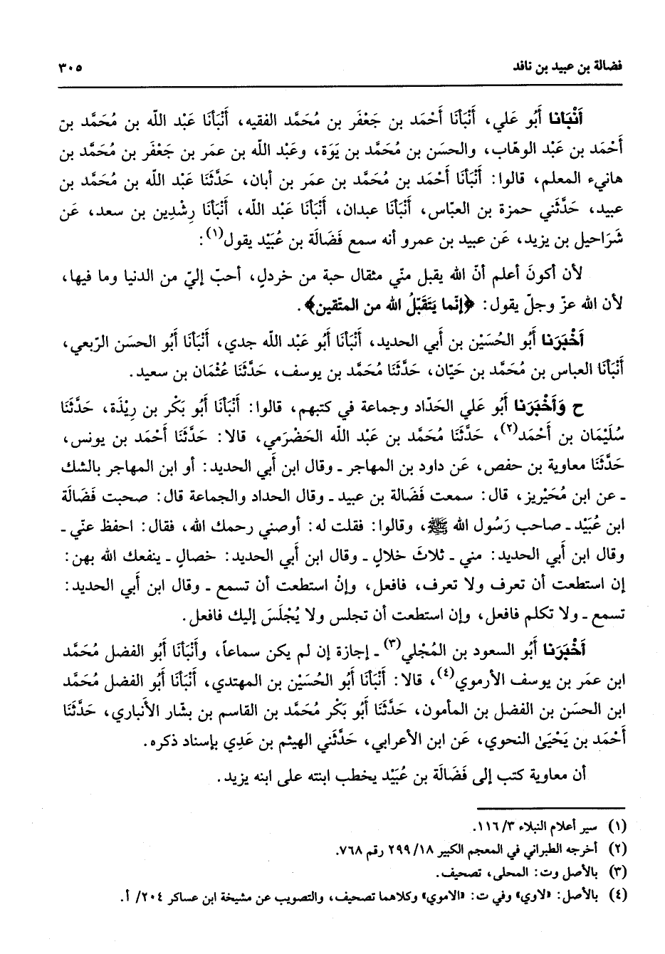 أنبأنا أبو علي أنبأنا أحمد بن جعفر بن محمد الفقيه أنبأنا عبد الله بن محمد بن أحمد بن عبد الوهاب والحسن بن محمد بن يوة وعبد الله بن عمر بن جعفر بن محمد بن هانئ المعلم قالوا أنبأنا احمد بن محمد بن عبيد حدثني حمزة بن العباس أنبأنا عبدان أنبأنا عبد الله أنبأنا رشدين بن سعد عن شراحيل بن يزيد عن عبيد بن عمرو أنه سمع فضالة بن عبيد يقول (1) لأن أكون أعلم أن الله يقبل مني مثقال حبة من خردل أحب إلي من الدنيا وما فيها لأن الله عز وجل يقول " إنما يتقبل الله من المتقين " أخبرنا أبو الحسين بن أبي الحديد أنبأنا أبو عبد الله جدي أنبأنا أبو الحسن الربعي أنبأنا العباس بن محمد بن حيان حدثنا محمد بن يوسف حدثنا عثمان بن سعيد ح وأخبرنا أبو علي الحداد وجماعة في كتبهم قالوا أنبأنا أبو بكر بن ريذة حدثنا سليمان بن أحمد (2) حدثنا محمد بن عبد الله الحضرمي قالا حدثنا أحمد بن يونس حدثنا معاوية بن حفص عن داود المهاجر وقال ابن أبي الحديد أو ابن المهاجر بالشك ب عن ابن محيريز قال سمعت فضالة بن عبيد وقال الحداد والجماعة قال صحبت فضالة ابن عبيد صاحب رسول الله (صلى الله عليه وسلم) وقالوا فقلت له أوصني رحمك الله فقال احفظ عني وقال ابن أبي الحديد مني ثلاث خلال وقال ابن أبي الحديد خصال ينفعك الله بهن إن استطعت أن تعرف ولا تعرف فافعل وإن استطعت أن تسمع وقال ابن أبي الحديد تسمع ولا تكلم فافعل وإن استطعت أن تجلس ولا يجلس إليك فافعل أخبرنا أبو السعود بن المجلي (3) إجازة إن لم يكن سماعا وأنبأنا أبو الفضل محمد ابن عمر بن يوسف الأرموي (4) قالا أنبأنا أبو الحسين بن المهتدي أنبأنا أبو الفضل محمد ابن الحسن بن الفضل بن المأمون حدثنا أبو بكر محمد بن القاسم بن بشار الأنباري حدثنا احمد بن يحيى النحوي عن ابن الأعرابي حدثني الهيثم بن عدي بإسناد ذكره أن معاوية كتب إلى فضالة بن عبيد يخطب ابنته على ابنه يزيد