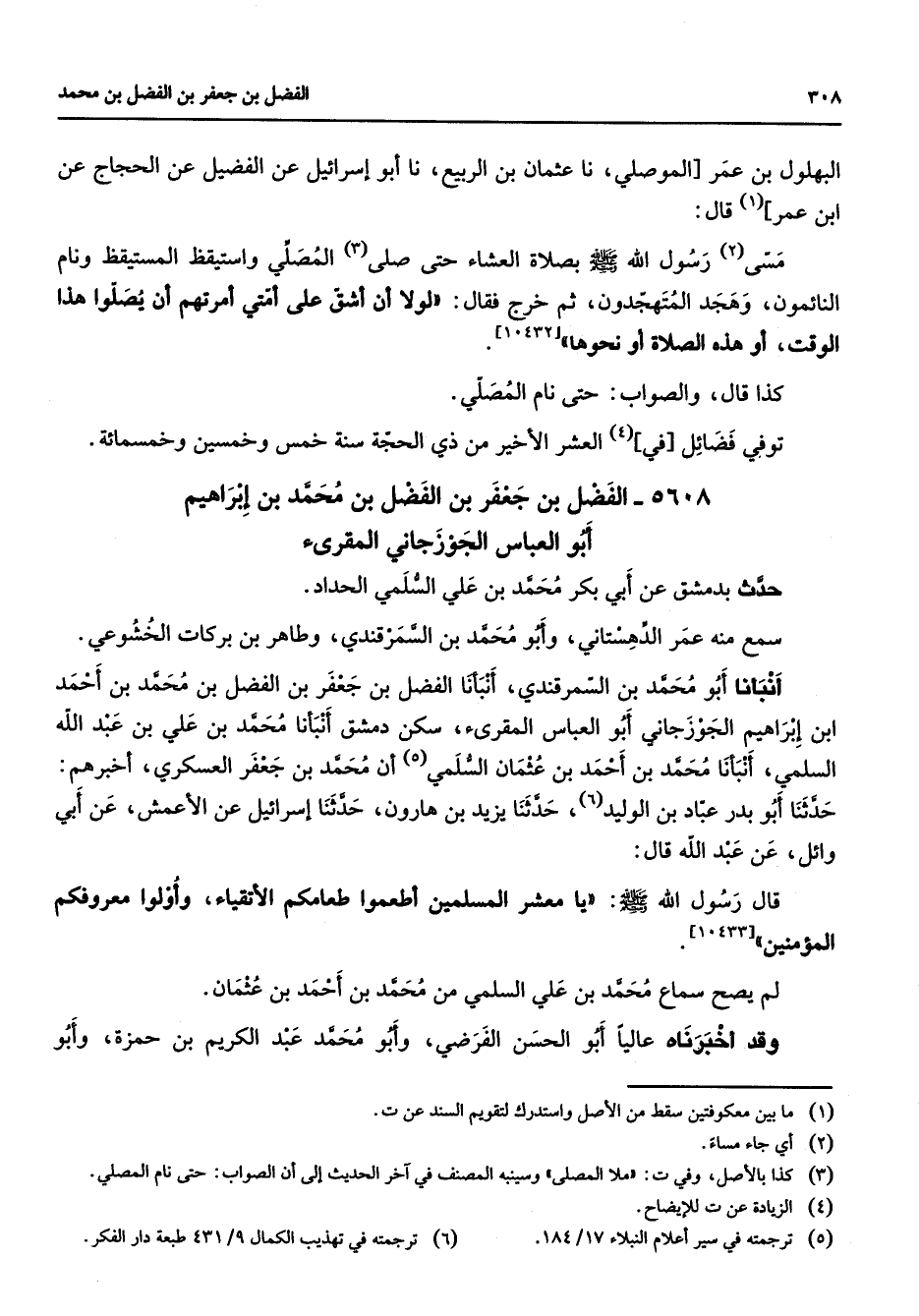 البهلول بن عمر الموصلي نا عثمان بن الربيع نا أبو إسرائيل عن الفضيل عن الحجاج عن ابن عمر (1) قال مسى (2) رسول الله (صلى الله عليه وسلم) بصلاة العشاء حتى صلى (3) المصلي واستيقظ المستيقظ ونام النائمون وهجد المتهجدون ثم خرج فقال لولا أن أشق على أمتي أمرتهم أن يصلوا هذا الوقت أو هذه الصلاة أو نحوها كذا قال والصواب حتى نام المصلي توفي فضائل في (4) العشر الأخير من ذي الحجة سنة خمس وخمسين وخمسمائة