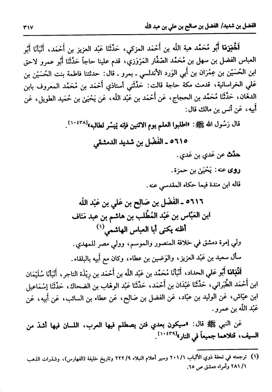 5616 - الفضل بن صالح بن علي بن عبد الله ابن العباس بن عبد المطلب بن هاشم بن عبد مناف أظنه يكنى أبا العباس الهاشمي (1) ولي إمرة دمشق في خلافة المنصور والموسم وولي مصر للمهدي سأل سعيد بن عبد العزيز والوضين بن عطاء وكان مع أبيه بالبلقاء أنبأنا أبو علي الحداد أنبأنا محمد بن عبد الله بن أحمد بن ريذة التاجر أنبأنا سليمان ابن أحمد الطبراني حدثنا عبدان بن أحمد حدثنا عبد الوهاب بن الضحاك حدثنا إسماعيل ابن عياش عن الوليد بن عباد عن الفضل بن صالح عن عطاء بن السائب عن أبيه عن عبد الله بن عمرو عن النبي (صلى الله عليه وسلم) قال سيكون بعدي فتن يصطلم فيها العرب اللسان فيها أشد من السيف قتلاهما جميعا في النار