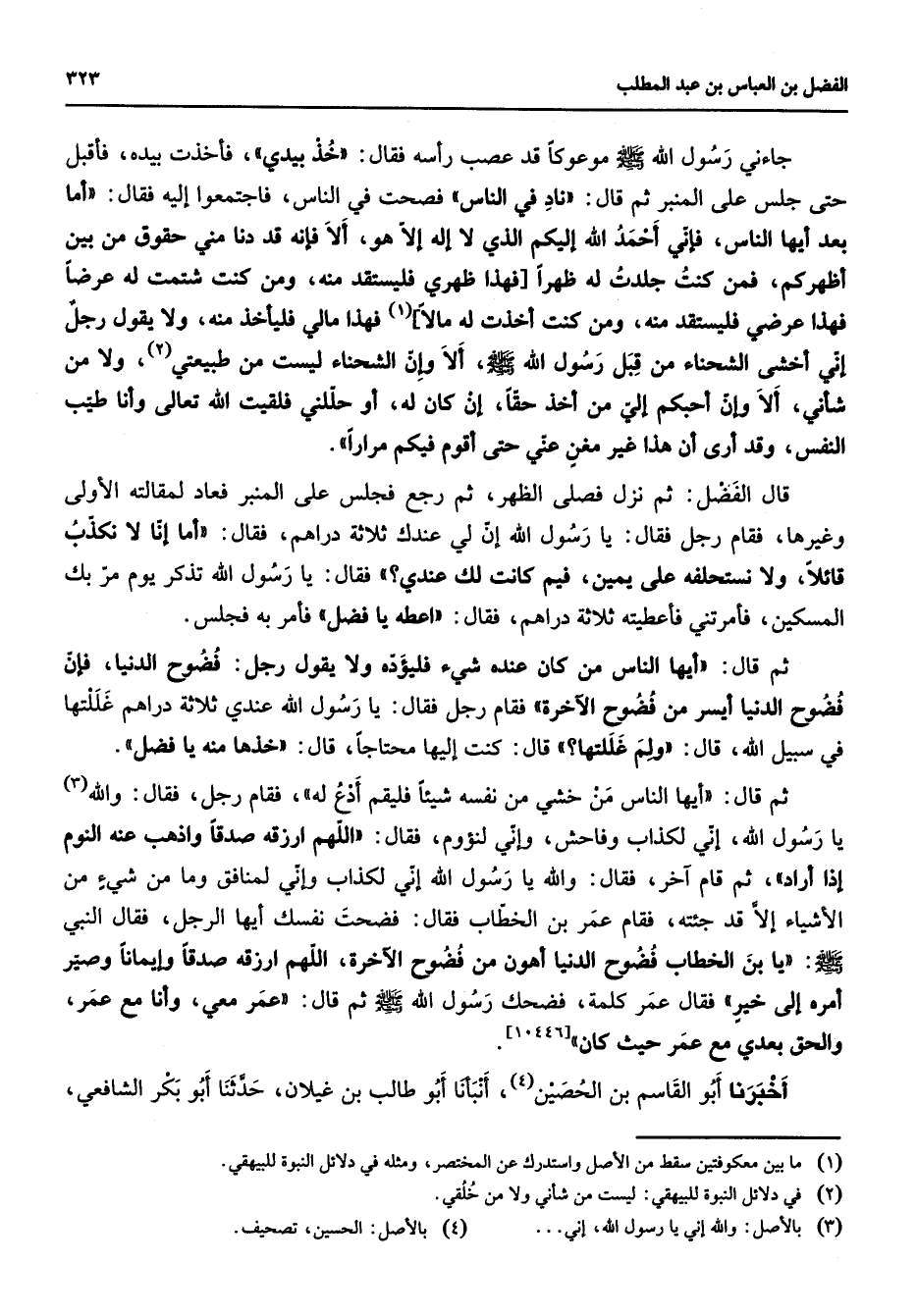 جاءني رسول الله (صلى الله عليه وسلم) موعوكا قد عصب رأسه فقال خذ بيدي فأخذت بيده فأقبل حتى جلس على المنبر ثم قال ناد في الناس فصحت في الناس فاجتمعوا إليه فقال أما بعد أيها الناس فإني أحمد الله إليكم الذي لا إله إلا هو ألا فإنه قد دنا مني حقوق من بين أظهركم فمن كنت قد جلدت له ظهرا فهذا ظهري فليستقد منه ومن كنت شتمت له عرضا فهذا عرضي فليستقد منه ومن كنت أخذت له مالا (1) فهذا مالي فليأخذ منه ولا يقول رجل إني أخشى الشحناء من قبل رسول الله (صلى الله عليه وسلم) ألا وإن الشحناء ليست من طبيعتي (2) ولا من شأني ألا وإن أحبكم إلي من أخذ حقا إن كان له أو حللني فلقيت الله تعالى وأنا طيب النفس وقد أرى أن هذا غير مغن عني حتى أقوم فيكم مرارا قال الفضل ثم نزل فصلى الظهر ثم رجع فجلس على المنبر فعاد لمقالته الأولى وغيرها فقام رجل فقال يا رسول الله إن لي عندك ثلاثة دراهم فقال أما إنا لا نكذب قائلا ولا نستحلفه على يمين فيم كانت لك عندي فقال يا رسول الله تذكر يوم مر بك المسكين فأمرتني فأعطيته ثلاثة دراهم فقال أعطه يا فضل فأمر به فجلس ثم قال أيها الناس من كان عنده شئ فليؤده ولا يقول رجل فضوح الدنيا فإن فضوح الدنيا أيسر من فضوح الآخرة فقام رجل فقال يا رسول الله عندي ثلاثة دراهم غللتها في سبيل الله قال ولم غللتها قال كنت إليها محتاجا قال خذها منه يا فضل ثم قال أيها الناس من خشي من نفسه شيئا فليقم ادع له فقام رجل فقال والله (3) يا رسول الله إني لكذاب وفاحش وإني لنؤوم فقال اللهم ارزقه صدقا واذهب عنه النوم إذا أراد ثم قام آخر فقال والله يا رسول الله إني لكذاب وإني لمنافق وما من شئ من الأشياء إلا قد جئته فقام عمر بن الخطاب فقال فضحت نفسك أيها الرجل فقال النبي (صلى الله عليه وسلم) يابن الخطاب فضوح الدنيا أهون من فضوح الاخرة اللهم ارزقه صدقا وإيمانا وصير أمره إلى خير فقال عمر كلمة فضحك رسول الله (صلى الله عليه وسلم) ثم قال عمر معي وأنا مع عمر والحق بعدي مع عمر حيث كان أخبرنا أبو القاسم بن الحصين (4) أنبأنا أبو طالب بن غيلان حدثنا أبو بكر الشافعي