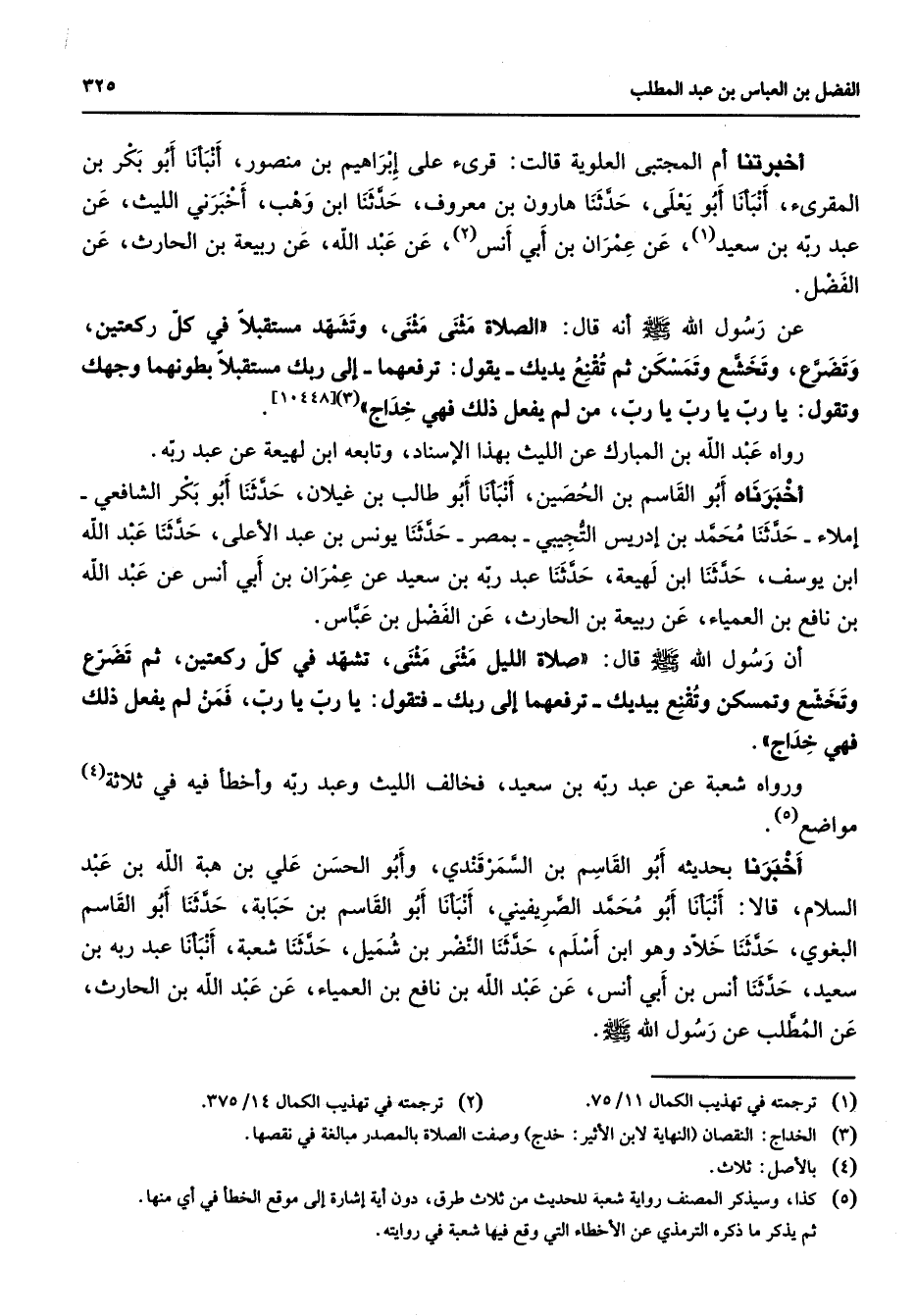 أخبرتنا أم المجتبى العلوية قالت قرئ على إبراهيم بن منصور أنبأنا أبو بكر بن المقرئ أنبأنا أبو يعلى حدثنا هارون بن معروف حدثنا ابن وهب أخبرني الليث عن عبد ربه بن سعيد (1) عن عمران بن أبي أنس (2) عن عبد الله عن ربيعة بن الحارث عن الفضل عن رسول الله (صلى الله عليه وسلم) أنه قال الصلاة مثنى مثنى وتشهد مستقبلا في كل ركعتين وتضرع وتخشع وتمسكن ثم تقنع يديك يقول ترفعهما إلى ربك مستقبلا بطونهما وجهك وتقول يا رب يا رب يا رب من لم يفعل ذلك فهي خداج (3) رواه عبد الله بن المبارك عن الليث بهذا الإسناد وتابعه ابن لهيعة عن عبد ربه أخبرناه أبو القاسم بن الحصين أنبأنا أبو طالب بن غيلان حدثنا أبو بكر الشافعي إملاء حدثنا محمد بن إدريس التجيبي بمصر حدثنا يونس بن عبد الأعلى حدثنا عبد الله ابن يوسف حدثنا ابن لهيعة حدثنا عبد ربه بن سعيد عن عمران بن أبي أنس عن عبد الله بن نافع بن العمياء عن ربيعة بن الحارث عن الفضل بن عباس أن رسول الله (صلى الله عليه وسلم) قال صلاة الليل مثنى مثنى تشهد في كل ركعتين ثم تضرع وتخشع وتمسكن وتقنع بيديك ترفعهما إلى ربك فتقول يا رب يا رب فمن لم يفعل ذلك فهي خداج ورواه شعبة عن عبد ربه بن سعيد فخالف الليث وعبد ربه وأخطأ فيه ثلاثة (4) مواضع (5) أخبرنا بحديثه أبو القاسم بن السمرقندي وأبو الحسن علي بن هبة الله بن عبد السلام قالا أنبأنا أبو محمد الصريفيني أنبأنا أبو القاسم بن حبابة حدثنا أبو القاسم البغوي حدثنا خلاد وهو ابن أسلم حدثنا النضر بن شميل حدثنا شعبة أنبأنا عبد ربه بن سعيد حدثنا أنس بن أبي أنس عن عبد الله بن نافع بن العمياء عن عبد الله بن الحارث عن المطلب عن رسول الله (صلى الله عليه وسلم)