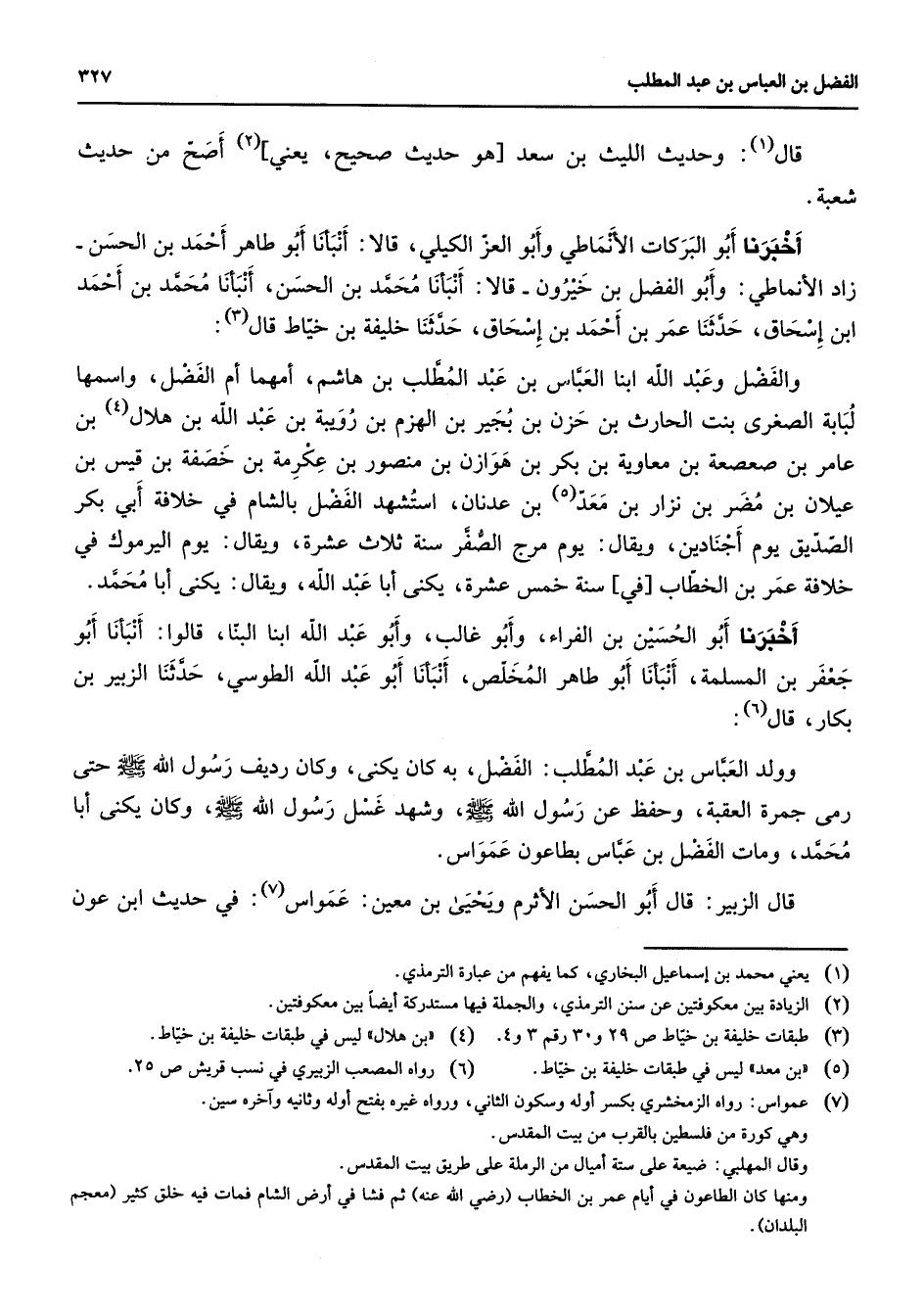 قال (1) وحديث الليث بن سعد هو حديث صحيح يعني (2) أصح من حديث شعبة أخبرنا أبو البركات الأنماطي وأبو العز الكيلي قالا أنبأنا أبو طاهر أحمد بن الحسن زاد الأنماطي وأبو الفضل بن خيرون قالا أنبأنا محمد بن الحسن أنبأنا محمد بن أحمد ابن إسحاق حدثنا عمر بن أحمد بن إسحق حدثنا خليفه بن خياط قال (3) والفضل وعبد الله ابنا العباس بن عبد المطلب بن هاشم أمهما أم الفضل واسمها لبابة الصغرى بنت الحارث بن حزن بن بجير بن الهزم بن رويبة بن عبد الله بن هلال (4) بن عامر بن صعصعة بن معاوية بن بكر بن هوازان بن منصور بن عكرمة بن خصفة بن قيس بن عيلان بن مضر بن نزار بن معد (5) بن عدنان استشهد الفضل بالشام في خلافة أبي بكر الصديق يوم أجنادين ويقال يوم مرج الصفر سنة ثلاث عشرة ويقال يوم اليرموك في خلافة عمر بن الخطاب في سنة خمس عشرة يكنى أبا عبد الله ويقال يكنى أبا محمد أخبرنا أبو الحسين بن الفراء وأبو غالب وأبو عبد الله ابنا البنا قالوا أنبأنا أبو جعفر بن المسلمة أنبأنا أبو طاهر المخلص أنبانا أبو عبد الله الطوسي حدثنا الزبير بن بكار قال (6) وولد العباس بن عبد المطلب الفضل به كان يكنى وكان رديف رسول الله (صلى الله عليه وسلم) حتى رمى جمرة العقبة وحفظ عن رسول الله (صلى الله عليه وسلم) وشهد غسل رسول الله (صلى الله عليه وسلم) وكان يكنى أبا محمد ومات الفضل بن عباس بطاعون عمواس قال الزبير قال أبو الحسن الأثرم ويحيى بن معين عمواس (7) في حديث ابن عون