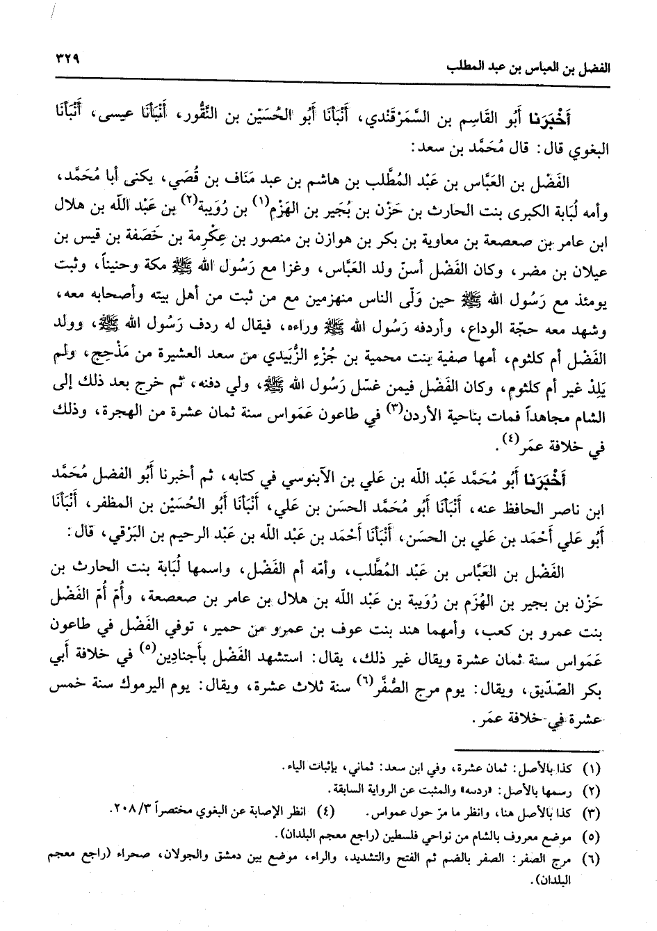 أخبرنا أبو القاسم بن السمرقندي أنبأنا أبو الحسين بن النقور أنبأنا عيسى أنبأنا البغوي قال قال محمد بن سعد الفضل بن العباس بن عبد المطلب بن هاشم بن عبد مناف بن قصي يكنى أبا محمد وأمه لبابة الكبرى بنت الحارث بن حزن بن بجير بن الهزم (1) بن رويبة (2) بن عبد الله بن هلال ابن عامر بن صعصعة بن معاوية بن بكر بن هوازن بن منصور بن عكرمة بن خصفة بن قيس بن عيلان بن مضر وكان الفضل أسن ولد العباس وغزا مع رسول الله (صلى الله عليه وسلم) مكة وحنينا وثبت يومئذ مع رسول الله (صلى الله عليه وسلم) حين ولى الناس منهزمين مع من ثبت من أهل بيته وأصحابه معه وشهد حجة الوداع وأردفه رسول الله (صلى الله عليه وسلم) وراءه فيقال له ردف رسول الله (صلى الله عليه وسلم) وولد الفضل أم كلثوم أمها صفية بنت محمية بن جزء الزبيدي من سعد العشيرة من مذحج ولم يلد غير أم كلثوم وكان الفضل فيمن غسل رسول الله (صلى الله عليه وسلم) ولي دفنه ثم خرج بعد ذلك إلى الشام مجاهدا فمات بناحية الأردن (3) في طاعون عمواس سنة ثمان عشرة من الهجرة وذلك في خلافة عمر (4) أخبرنا أبو محمد عبد الله بن علي بن الآبنوسي في كتابه ثم أخبرنا أبو الفضل محمد ابن ناصر الحافظ عنه أنبأنا أبو محمد الحسن بن علي أنبأنا أبو الحسين بن المظفر أنبأنا أبو علي أحمد بن علي بن الحسن أنبأنا أحمد بن عبد الله بن عبد الرحيم بن البرقي قال الفضل بن العباس بن عبد المطلب وأمه أم الفضل واسمها لبابة بنت الحارث بن حزن بن بجير بن الهزم بن رويبة بن عبد الله بن هلال بن عامر بن صعصعة وأم أم الفضل بنت عمرو بن كعب وأمهما هند بن عوف بن عمرو بن حمير توفي الفضل في طاعون عمواس سنة ثمان عشرة ويقال غير ذلك يقال استشهد الفضل بأجنادين (5) في خلافة أبي بكر الصديق ويقال يوم مرج الصفر (6) سنة ثلاث عشرة ويقال يوم اليرموك سنة خمس عشرة في خلافة عمر