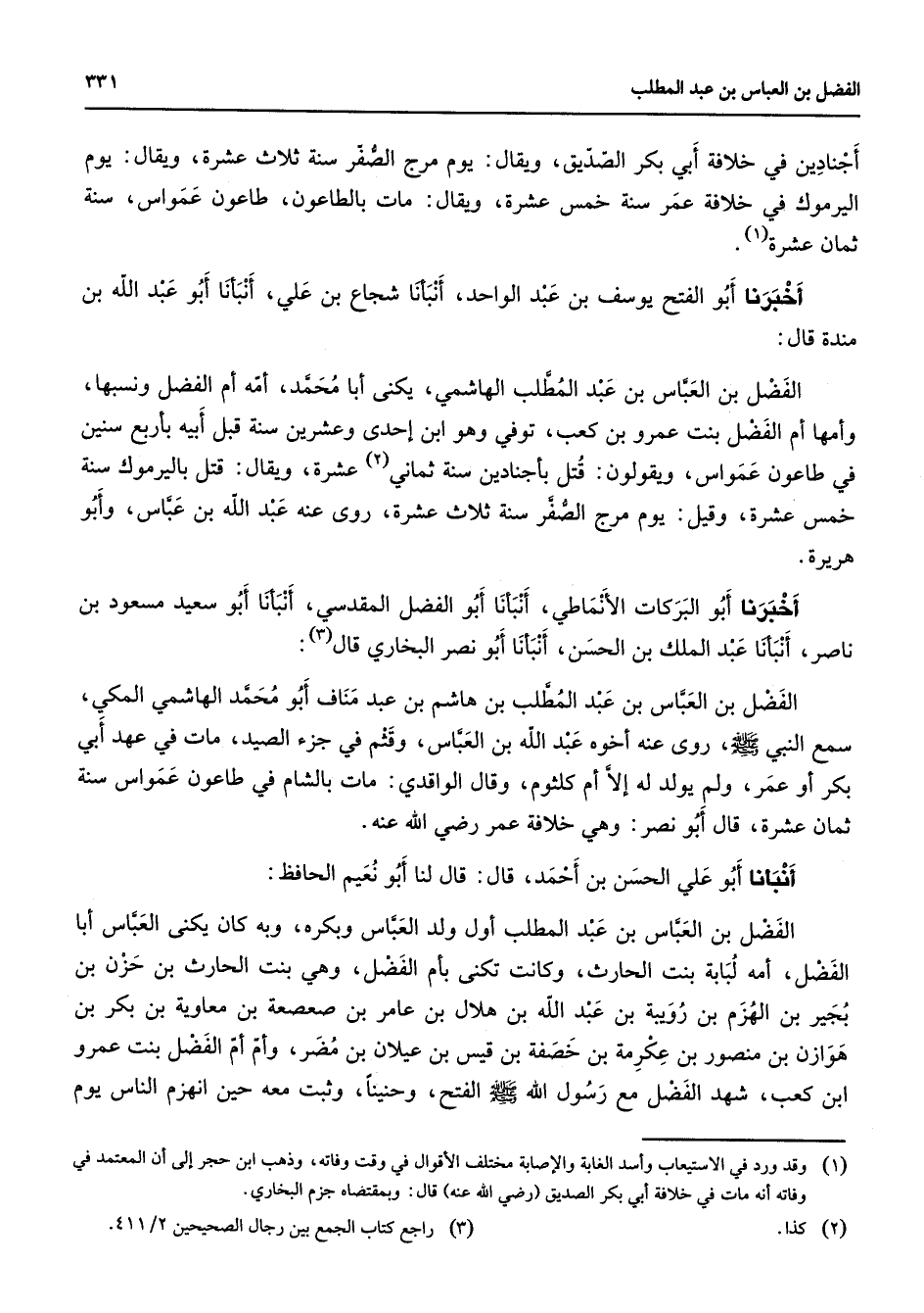 أجنادين في خلافة أبي بكر الصديق ويقال يوم مرج الصفر سنة ثلاث عشرة ويقال يوم اليرموك في خلافة عمر سنة خمس عشرة ويقال مات بالطاعون طاعون عمواس سنة ثمان عشرة (1) أخبرنا أبو الفتح يوسف بن عبد الواحد أنبأنا شجاع بن علي أنبأنا أبو عبد الله بن مندة قال الفضل بن العباس بن عبد المطلب الهاشمي يكنى أبا محمد أمه أم الفضل ونسبها وأمها أم الفضل بنت عمرو بن كعب توفي وهو ابن إحدى وعشرين سنة قبل أبيه بأربع سنين في طاعون عمواس ويقولون قتل بأجنادين سنة ثماني (2) عشرة ويقال قتل باليرموك سنة خمس عشرة وقيل يوم مرج الصفر سنة ثلاث عشرة روى عنه عبد الله بن عباس وأبو هريرة أخبرنا أبو البركات الأنماطي أنبأنا أبو الفضل المقدسي أنبأنا أبو سعيد مسعود بن ناصر أنبأنا عبد الملك بن الحسن أنبأنا أبو نصر البخاري قال (3) الفضل بن العباس بن عبد المطلب بن هاشم بن عبد مناف أبو محمد الهاشمي المكي سمع النبي (صلى الله عليه وسلم) روى عنه أخوه عبد الله بن العباس وقثم في جزء الصيد مات في عهد أبي بكر أو عمر ولم يولد له إلا أم كلثوم وقال الواقدي مات بالشام في طاعون عمواس سنة ثمان عشرة قال أبو نصر وهي خلافة عمر Bهـ أنبأنا أبو علي الحسن بن أحمد قال قال لنا أبو نعيم الحافظ الفضل بن العباس بن عبد المطلب أول ولد العباس وبكره وبه كان يكنى العباس أبا الفضل أمه لبابة بنت الحارث وكانت تكنى بأم الفضل وهي بنت الحارث بن حزن بن بجير بن الهزم بن رويبة بن عبد الله بن هلال بن عامر بن صعصعة بن معاوية بن بكر بن هوازن بن منصور بن عكرمة بن خصفة بن قيس بن عيلان بن مضر وأم أم الفضل بنت عمرو ابن كعب شهد الفضل مع رسول الله (صلى الله عليه وسلم) الفتح وحنينا وثبت معه حين انهزم الناس يوم