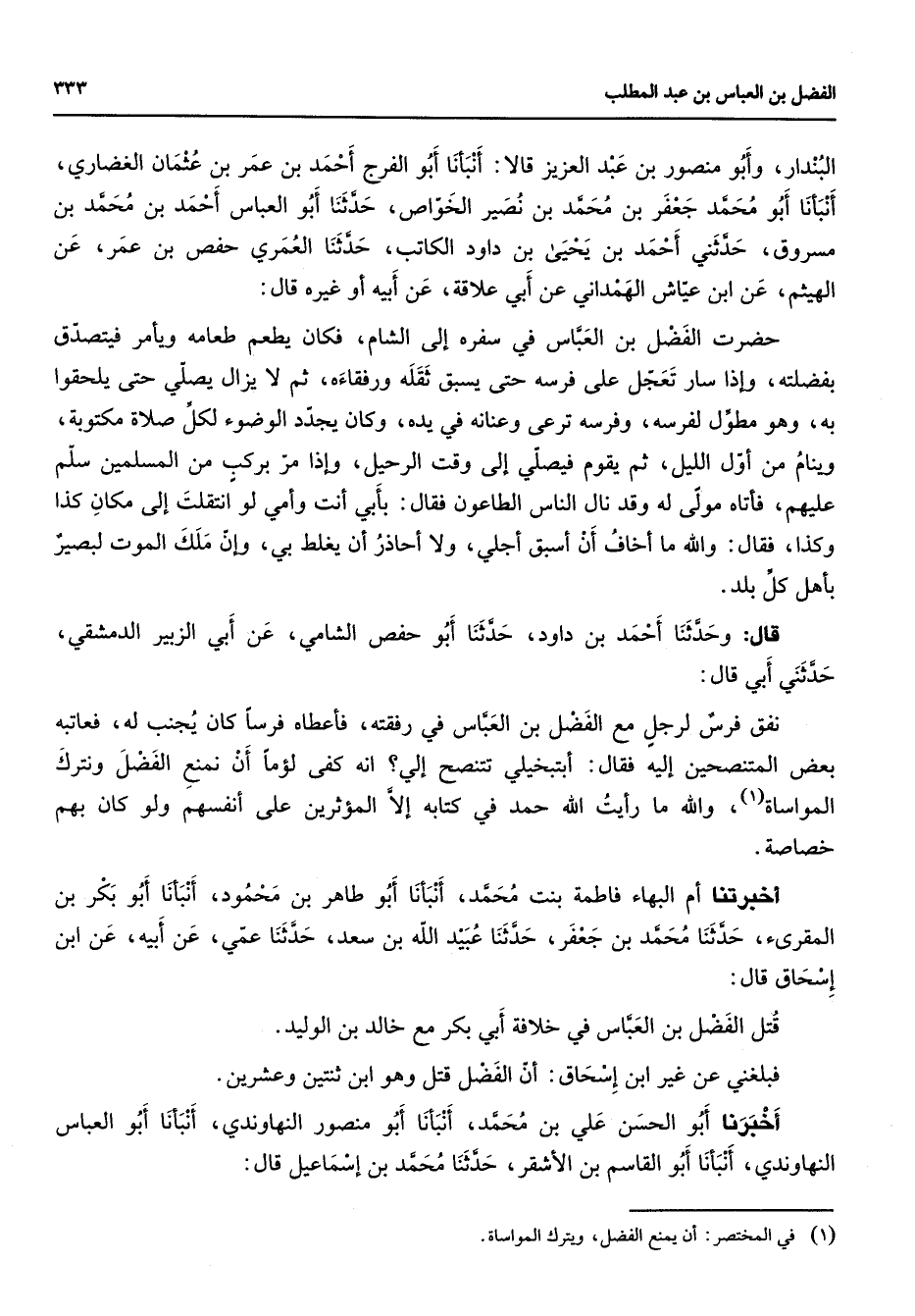 البندار وأبو منصور بن عبد العزيز قالا أنبأنا أبو الفرج أحمد بن عمر بن عثمان الغضاري أنبأنا أبو محمد جعفر بن محمد بن نصير الخواص حدثنا أبو العباس أحمد بن محمد بن مسروق حدثني أحمد بن يحيى بن داود الكاتب حدثنا العمري حفص بن عمر عن الهيثم عن ابن عياش الهمداني عن أبي علاقة عن أبيه أو غيره قال حضرت الفضل بن العباس في سفره إلى الشام فكان يطعم طعامه ويأمر فيتصدق بفضلته وإذا سار تعجل على فرسه حتى يسبق ثقله ورفقاءه ثم لا يزال يصلي حتى يلحقوا به وهو مطول لفرسه وفرسه ترعى وعنانه في يده وكان يجدد الوضوء لكل صلاة مكتوبة وينام من أول الليل ثم يقوم فيصلي إلى وقت الرحيل وإذا مر بركب من المسلمين سلم عليهم فأتاه مولى له وقد نال الناس الطاعون فقال بأبي أنت وأمي لو انتقلت إلى مكان كذ اوكذا فقال والله ما أخاف أن أسبق أجلي ولا أحاذر أن يغلط بي وإن ملك الموت لبصير بأهل كل بلد قال وحدثنا أحمد بن داود حدثنا أبو حفص الشامي عن أبي الزبير الدمشقي حدثني أبي قال نفق فرس لرجل مع الفضل بن العباس في رفقته فأعطاه فرسا كان يجنب له فعاتبه بعض المتنصحين إليه فقال أبتبخيلي تتنصح إلي انه كفى لؤما أن نمنع الفضل ونترك المواساة (1) والله ما رأيت الله حمد في كتابه إلا المؤثرين على أنفسهم ولو كان بهم خصاصة أخبرتنا أم البهاء فاطمة بنت محمد أنبأنا أبو طاهر بن محمود أنبأنا أبو بكر بن المقرئ حدثنا محمد بن جعفر حدثنا عبيد الله بن سعد حدثنا عمي عن أبيه عن ابن إسحاق قال قتل الفضل بن العباس في خلافة أبي بكر مع خالد بن الوليد فبلغني عن غير ابن إسحاق أن الفضل قتل وهو ابن ثنتين وعشرين أخبرنا أبو الحسن علي بن محمد أنبأنا أبو منصور النهاوندي أنبأنا أبو العباس النهاوندي أنبأنا أبو القاسم بن الأشقر حدثنا محمد بن إسماعيل قال