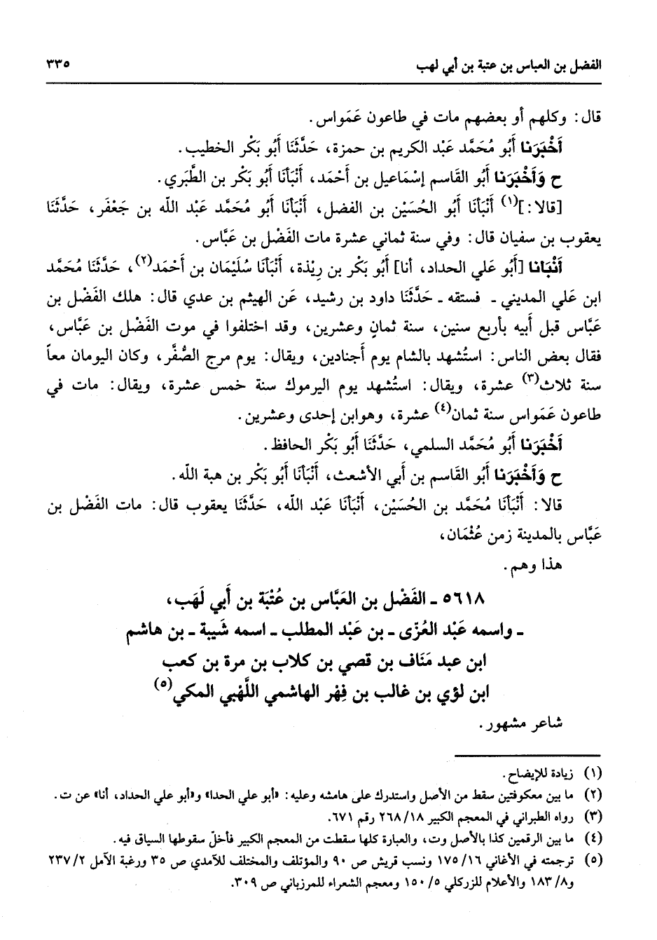 5618 - الفضل بن العباس بن عتبة بن أبي لهب واسمه عبد العزى بن عبد المطلب اسمه شيبة بن هاشم ابن عبد مناف بن قصي بن كلاب بن مرة بن كعب ابن لؤي بن غالب بن فهر الهاشمي اللهبي المكي (5) شاعر مشهور
