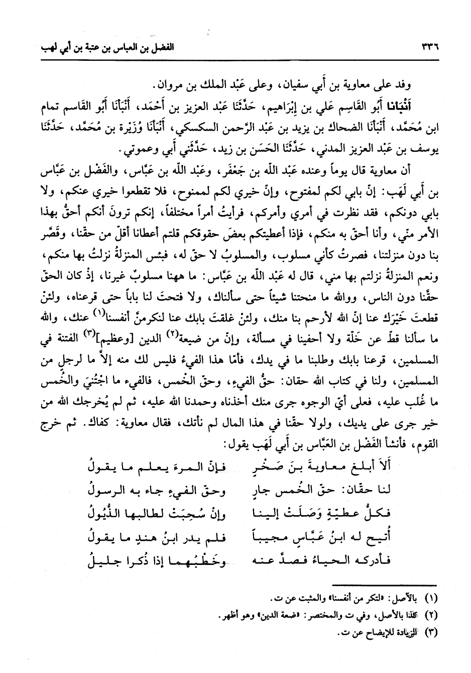 وفد على معاوية بن أبي سفيان وعلى عبد الملك بن مروان أنبأنا أبو القاسم علي بن إبراهيم حدثنا عبد العزيز بن أحمد أنبأنا أبو القاسم تمام ابن محمد أنبأنا الضحاك بن يزيد بن عبد الرحمن السكسكي أنبأنا وزيرة بن محمد حدثنا يوسف بن عبد العزيز المدني حدثنا الحسن بن زيد حدثني أبي وعموتي أن معاوية قال يوما وعنده عبد الله بن جعفر وعبد الله بن عباس والفضل بن عباس بن أبي لهب إن بابي لكم لمفتوح وإن خيري لكم لممنوح فلا تقطعوا خيري عنكم ولا بابي دونكم فقد نظرت في أمري وأمركم فرأيت أمرا مختلفا إنكم ترون أنكم أحق بهذا الأمر مني وأنا أحق به منكم فإذا أعطيتكم بعض حقوقكم قلتم أعطانا أقل من حقنا وقصر بنا دون منزلتنا فصرت كأني مسلوب والمسلوب لا حق له فبئس المنزلة نزلت بها منكم ونعم المنزلة نزلتم بها مني قال له عبد الله بن عباس ما ههنا مسلوب غيرنا إذ كان الحق حقنا دون الناس ووالله ما منحتنا شيئا حتى سألناك ولا فتحت لنا بابا حتى قرعناه ولئن قطعت خيرك عنا إن الله لأرحم بنا منك ولئن غلقت بابك عنا لنكرمن أنفسنا (1) عنك والله ما سألنا قط عن خلة ولا أحفينا في مسألة وإن من ضيعة (2) الدين وعظيم (3) الفتنة في المسلمين قرعنا بابك وطلبنا ما في يدك فأما هذا الفئ فليس لك منه إلا ما لرجل من المسلمين ولنا في كتاب الله حقان حق الفئ وحق الخمس فالفئ ما اجتني والخمس ما غلب عليه فعلى أي الوجوه جرى منك أخذناه وحمدنا الله عليه ثم لم يخرجك الله من خير جرى على يديك ولولا حقنا في هذا المال لم نأتك فقال معاوية كفاك ثم خرج القوم فأنشأ الفضل بن العباس بن أبي لهب يقول * ألا أبلغ معاوية بن صخر * فإن المرء يعلم يا يقول لنا حقان حق الخمس جار * وحق الفئ جاء به الرسول فكل عطية وصلت إلينا * وإن سحبت لطالبها الذيول أتيح له ابن عباس مجيبا * فلم يدر ابن هند ما يقول فأدركه الحياء فصد عنه * وخطبها إذا ذكرا جليل *