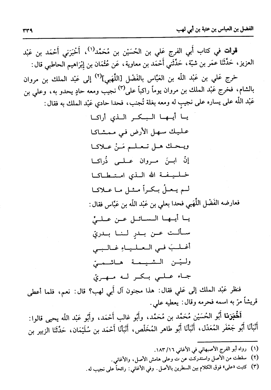 قرأت في كتاب أبي الفرج علي بن الحسين بن محمد (1) أخبرني أحمد بن عبد العزيز حدثنا عمر بن شبة حدثني أحمد بن معاوية عن عثمان بن إبراهيم الحاطبي قال خرج علي بن عبد الله بن العباس بالفضل اللهبي (2) إلى عبد الملك بن مروان بالشام فخرج عبد الملك بن مروان يوما راكبا على (3) نجيب ومعه حاد يحدو به وعلي بن عبد الله علي يساره على نجيب له ومعه بغلة تجنب فحدا حادي عبد الملك به فقال يا أيها البكر الذي أراكا * عليك سهل الأرض الذي ممشاكا * ويحك هل تعلم من علاكا * إن ابن مروان على ذراكا * خليفة الله الذي امتطاكا * لم يعل بكرا مثل ما علاكا فعارضه الفضل اللهبي فحدا بعلي بن عبد الله بن عباس فقال * يا أيها السائل عن علي * سألت عن بدر لنا بدري * أغلب في العلياء غالبي * ولين الشيمة هاشمي * جاء علي بكر له مهري فنظر عبد الملك إلى علي فقال هذا مجنون آل أبي لهب قال نعم فلماأعطى قريشا مر به اسمه فحرمه وقال يعطيه علي أخبرنا أبو الحسين محمد بن محمد وأبو غالب أحمد وأبو عبد الله يحيى قالوا أنبأنا أبو جعفر المعدل أنبأنا أبو طاهر المخلص أنبأنا أحمد بن سليمان حدثنا الزبير بن