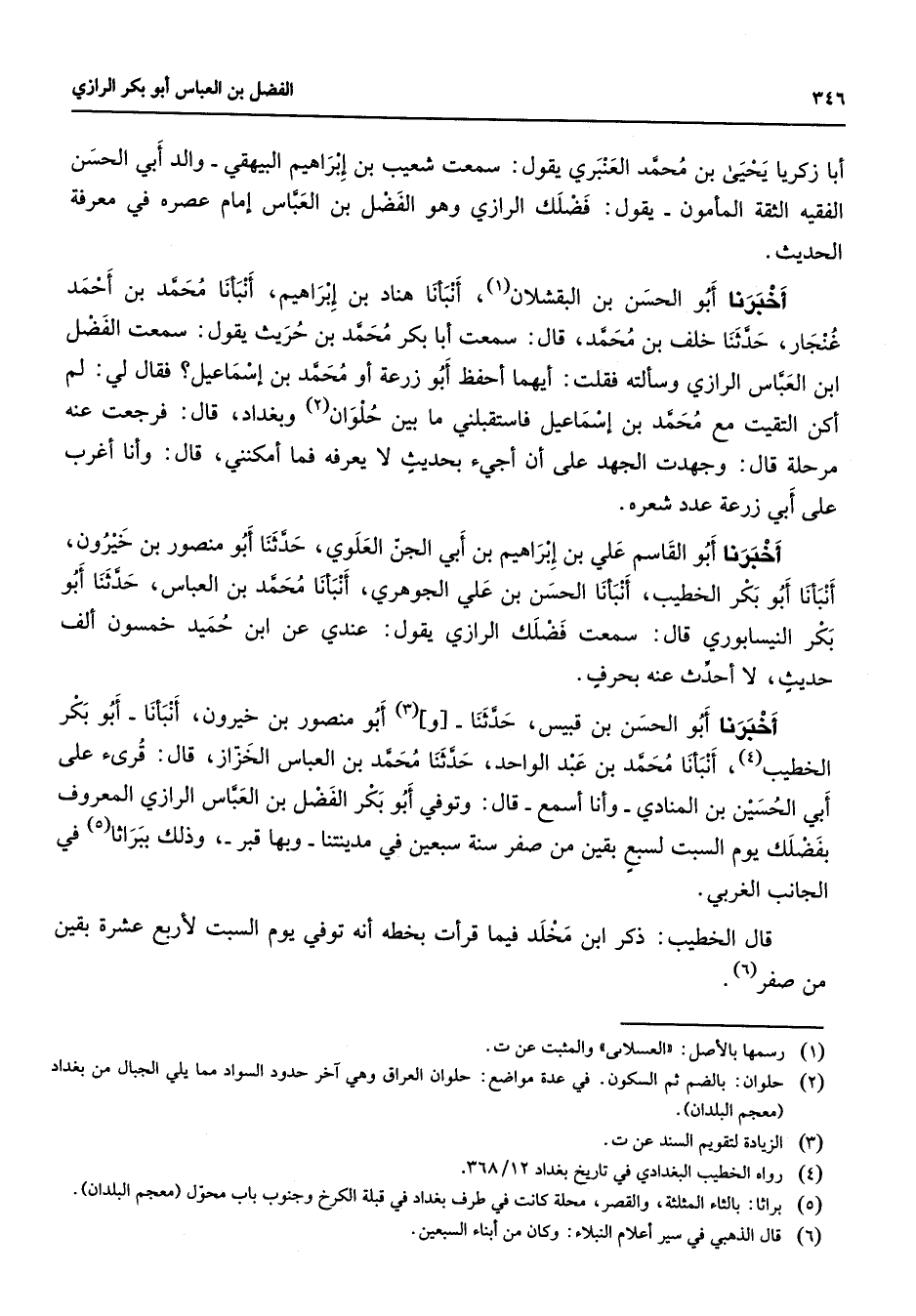 أبا زكريا يحيى بن محمد العنبري يقول سمعت شعيب بن إبراهيم البيهقي والد أبي الحسن الفقيه الثقة المأمون يقول فضلك الرازي وهو الفضل بن العباس إمام عصره في معرفة الحديث أخبرنا أبو الحسن بن البقشلان (1) أنبأنا هناد بن إبراهيم أنبأنا محمد بن أحمد غنجار حدثنا خلف بن محمد قال سمعت أبا بكر محمد بن حريث يقول سمعت الفضل ابن العباس الرازي وسألته فقلت أيهما أحفظ أبو زرعة أو محمد بن إسماعيل فقال لي لم أكن التقيت مع محمد بن إسماعيل فاستقبلني ما بين حلوان (2) وبغداد قال فرجعت عنه مرحلة قال وجهدت الجهد على أن أجئ بحديث لا يعرفه فما أمكنني قال وأنا أغرب على أبي زرعة عدد شعره أخبرنا أبو القاسم علي بن إبراهيم بن أبي الجن العلوي حدثنا أبو منصور بن خيرون أنبأنا أبو بكر الخطيب أنبأنا الحسن بن علي الجوهري أنبأنا محمد بن العباس حدثنا أبو بكر النيسابوري قال سمعت فضلك الرازي يقول عندي عن ابن حميد خمسون ألف حديث لاأحدث عنه بحرف أخبرنا أبو الحسن بن قبيس حدثنا و (3) أبو منصور بن خيرون أنبأنا أبو بكر الخطيب انبأنا محمد بن عبد الواحد حدثنا محمد بن العباس الخزاز قال قرئ على أبي الحسين بن المنادي وأنا أسمع قال وتوفي أبو بكر الفضل بن العباس الرازي المعروف بفضلك يوم السبت لسبع بقين من صفر سنة سبعين في مدينتنا وبها قبر وذلك ببراثا (5) في الجانب الغربي قال الخطيب ذكر ابن مخلد فيما قرأت بخطه أنه توفي يوم السبت لأربع عشرة بقين من صفر (6)