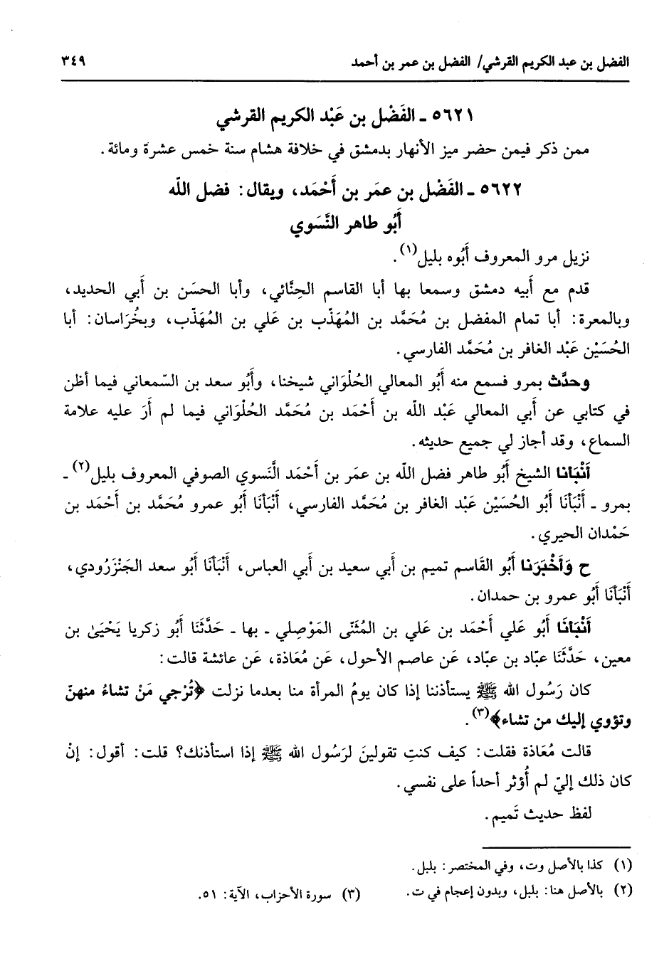 5622 - الفضل بن عمر بن أحمد ويقال فضل الله أبو طاهر النسوي نزيل مرو المعروف أبوه بليل (1) قدم مع أبيه دمشق وسمعا بها أبا القاسم الحنائي وأبا الحسن بن أبي الحديد وبالمعرة أبا تمام المفضل بن محمد بن المهذب بن علي بن المهذب وبخراسان أبا الحسين عبد الغافر بن محمد الفارسي وحدث بمرو فسمع منه أبو المعالي الحلواني شيخنا وأبو سعد بن السمعاني فيما أظن في كتابي عن أبي المعالي عبد الله بن أحمد بن محمد الحلواني فيما لم أر عليه علامة السماع وقد أجاز لي جميع حديثه أنبأنا الشيخ أبو طاهر فضل الله بن عمر بن أحمد النسوي الصوفي المعروف بليل (2) بمرو أنبأنا أبو الحسين عبد الغافر بن محمد الفارسي أنبأنا أبو عمرو محمد بن أحمد بن حمدان الحيري ح وأخبرنا أبو القاسم تميم بن أبي سعيد بن أبي العباس أنبأنا أبو سعد الجنزرودي أنبأنا أبو عمرو بن حمدان أنبأنا أبو علي أحمد بن علي بن المثنى الموصلي بها حدثنا أبو زكريا يحيى بن معين حدثنا عباد بن عباد عن عاصم الأحول عن معاذة عن عائشة قالت كان رسول الله (صلى الله عليه وسلم) يستأذننا إذا كان يوم المرأة منا بعدما نزلت " ترجي من تشاء منهن وتؤوي إليك من تشاء " (3) قالت معاذة فقلت كيف كنت تقولين لرسول الله (صلى الله عليه وسلم) إذا استأذنك قلت أقول إن كان ذلك إلي لم أؤثر أحدا على نفسي لفظ حديث تميم