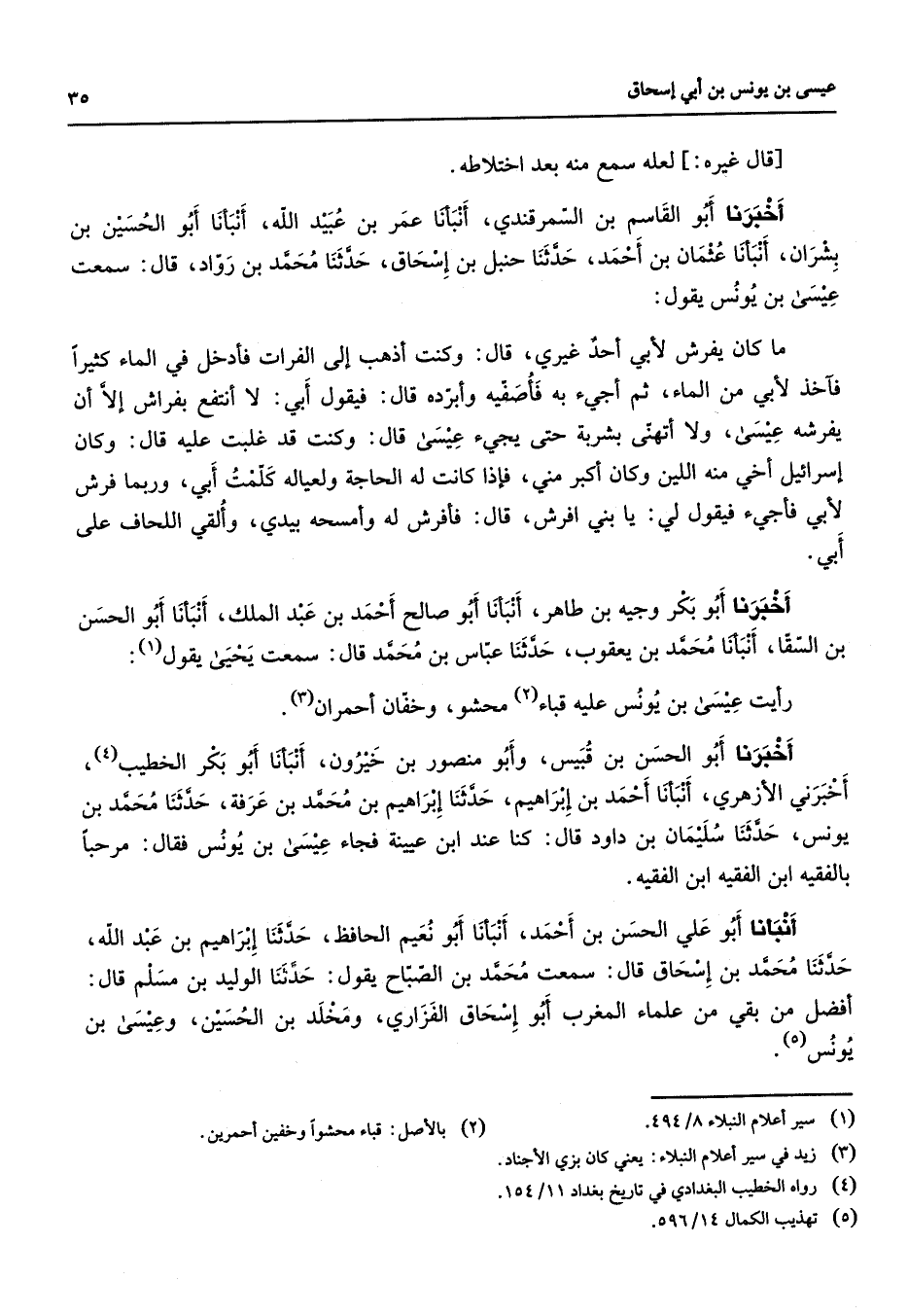قال غيره لعله سمع منه بعد اختلاطه أخبرنا أبو القاسم بن السمرقندي أنبأنا عمر بن عبيد الله أنبأنا أبو الحسين بن بشران أنبأنا عثمان بن أحمد حدثنا حنبل بن إسحاق حدثنا محمد بن رواد قال سمعت عيسى بن يونس يقول ما كان يفرش لأبي أحد غيري قال وكنت أذهب إلى الفرات فأدخل في الماء كثيرا فآخذ لأبي من الماء ثم أجئ به فأصفيه وأبرده قال فيقول أبي لا أنتفع بفراش إلا أن يفرشه عيسى ولا أتهنى بشربة حتى يجئ عيسى قال وكنت قد غلبت عليه قال وكان إسرائيل أخي منه اللين وكان أكبر مني فإذا كانت له الحاجة ولعياله كلمت أبي وربما فرش لأبي فأجئ فيقول لي يا بني افرش قال فأفرش له وأمسحه بيدي وألقي اللحاف على أبي أخبرنا أبو بكر وجيه بن طاهر أنبأنا أبو صالح أحمد بن عبد الملك أنبأنا أبو الحسن بن السقا أنبأنا محمد بن يعقوب حدثنا عباس بن محمد قال سمعت يحيى يقول (1) رأيت عيسى بن يونس عليه قباء (2) محشو وخفان أحمران (3) أخبرنا أبو الحسن بن قبيس وأبو منصور بن خيرون أنبأنا أبو بكر الخطيب (4) أخبرني الأزهري أنبأنا أحمد بن إبراهيم حدثنا إبراهيم بن محمد بن عرفة حدثنا محمد بن يونس حدثنا سليمان بن داود قال كنا عند ابن عيينة فجاء عيسى بن يونس فقال مرحبا بالفقيه ابن الفقيه ابن الفقيه أنبأنا أبو علي الحسن بن أحمد أنبأنا أبو نعيم الحافظ حدثنا إبراهيم بن عبد الله حدثنا محمد بن إسحاق قال سمعت محمد بن الصباح يقول حدثنا الوليد بن مسلم قال أفضل من بقي من علماء المغرب أبو إسحاق الفزاري ومخلد بن الحسين وعيسى بن يونس (5)