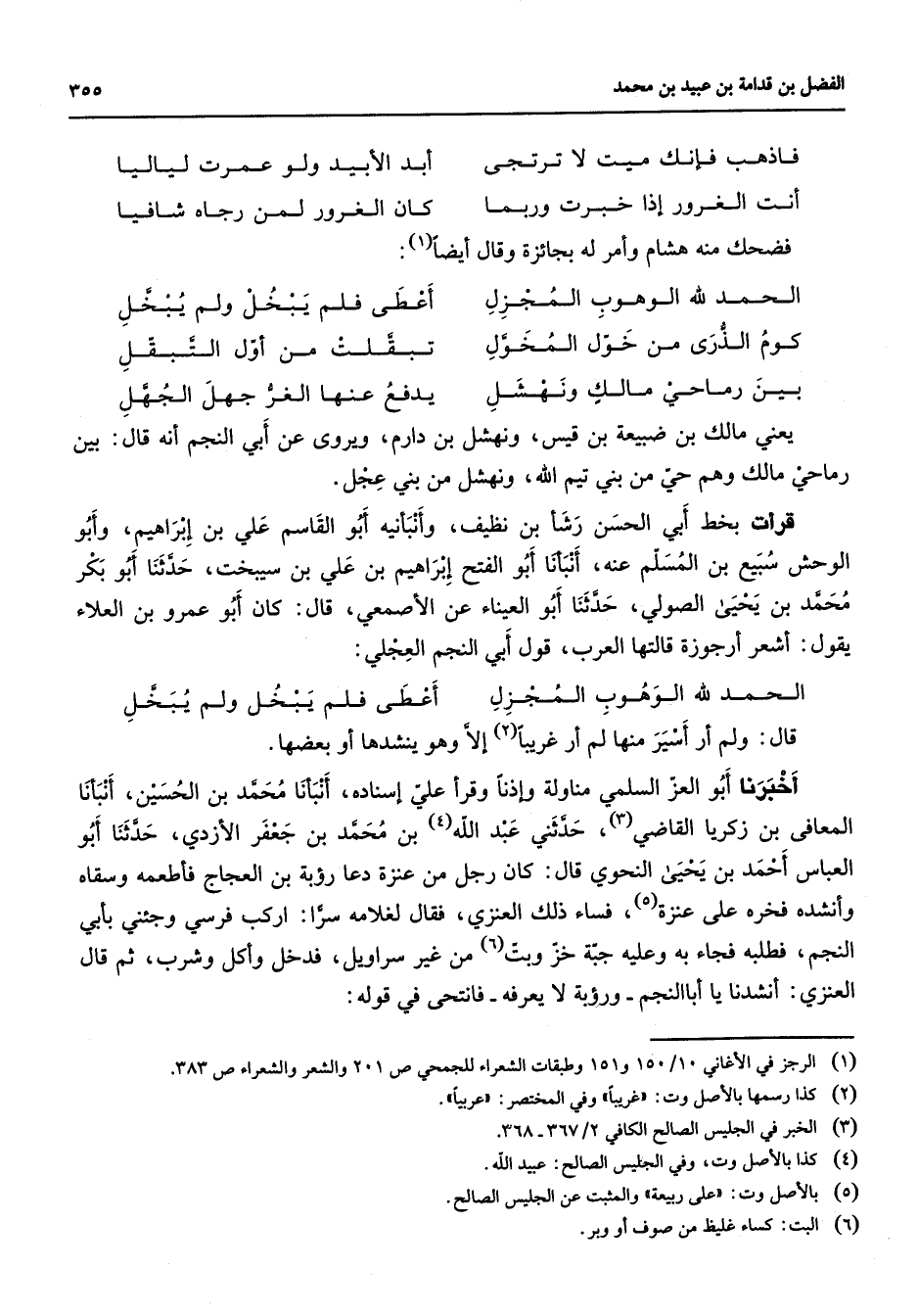 فاذهب فإنك ميت لا ترتجى * ابد الأبيد ولو عمرت لياليا أنت الغرور إذا خبرت وربما * كان الغرور لمن رجاه شافيا * فضحك منه هشام وأمر له بجائزة وقال أيضا (1) * الحمد لله الوهوب المجزل * أعطى فلم يبخل ولم يبخل كوم الذرى من خول المخول * تبقلت من أول التبقل بين رماحي مالك ونهشل * يدفع عنها الغر جهل الجهل * يعني مالك بن ضبيعة بن قيس ونهشل بن دارم ويروى عن أبي النجم أنه قال بين رماحي مالك وهم حي من بني تيم الله ونهشل من بني عجل قرأت بخط أبي الحسن رشأ بن نظيف وأنبأنيه أبو القاسم علي بن إبراهيم وأبو الوحش سبيع بن المسلم عنه أنبأنا أبو الفتح إبراهيم بن علي بن سيبخت حدثنا أبو بكر محمد بن يحيى الصولي حدثنا أبو العيناء عن الأصمعي قال كان أبو عمرو بن العلاء يقول أشعر أرجوزة قالتها العرب قول أبي النجم العجلي الحمد لله الوهوب المجزل * أعطى فلم يبخل ولم يبخل قال ولم أر أسير منها لم أر غريبا (2) إلا وهو ينشدها أو بعضها أخبرنا أبو العز السلمي مناولة وإذنا وقرأ علي إسناده أنبأنا محمد بن الحسين أنبأنا المعافى بن زكريا القاضي (3) حدثني عبد الله (4) بن محمد بن جعفر الأزدي حدثنا أبو العباس أحمد بن يحيى النحوي قال كان رجل من عنزة دعا رؤبة بن العجاج فأطعمه وسقاه وأنشده فخره على عنزة (5) فساء ذلك العنزي فقال لغلامه سرا اركب فرسي وجئني بأبي النجم فطلبه فجاء به وعليه جبة خز وبت (6) من غير سراويل فدخل وأكل وشرب ثم قال العنزي أنشدنا يا أبا النجم ورؤبة لا يعرفه فانتحى في قوله