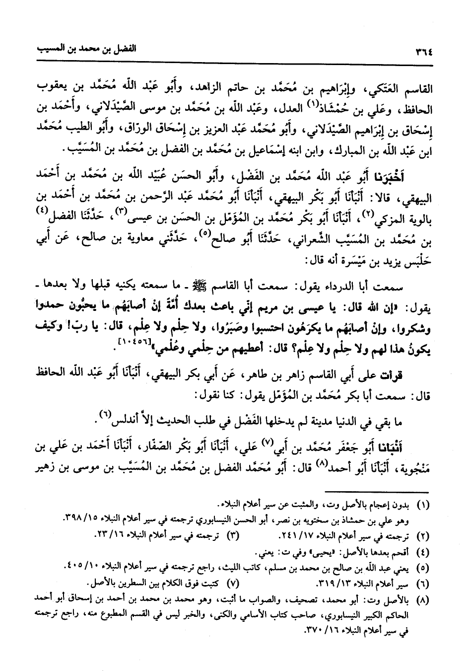 القاسم العتكي وإبراهيم بن محمد بن حاتم الزاهد وأبو عبد الله محمد بن يعقوب الحافظ وعلي بن حمشاذ (1) العدل وعبد الله بن محمد بن موسى الصيدلاني وأحمد بن إسحاق بن إبراهيم الصيدلاني وأبو محمد عبد العزيز بن إسحاق الوراق وأبو الطيب محمد ابن عبد الله بن المبارك وابن ابنه إسماعيل بن محمد بن الفضل بن محمد بن المسيب أخبرنا أبو عبد الله محمد بن الفضل وأبو الحسن عبيد الله بن محمد بن أحمد البيهقي قالا أنبأنا أبو بكر البيهقي أنبأنا أبو محمد عبد الرحمن بن محمد بن أحمد بن بالوية المزكي (2) أنبأنا أبو بكر محمد بن المؤمل بن الحسن بن عيسى (3) حدثنا الفضل (4) بن محمد بن المسيب الشعراني حدثنا أبو صالح (5) حدثني معاوية بن صالح عن أبي حلبس يزيد بن ميسرة أنه قال سمعت أبا الدرداء يقول سمعت أبا القاسم (صلى الله عليه وسلم) ما سمعته يكنيه قبلها ولا بعدها يقول إن الله قال يا عيسى بن مريم إني باعث بعدك أمة أن أصابهم ما يحبون حمدوا وشكروا وإن أصابهم ما يكرهون احتسبوا وصبروا ولا حلم ولا علم قال يا رب وكيف يكون هذا لهم ولا حلم ولا علم قال أعطيهم من حلمي وعلمي قرأت على أبي القاسم زاهر بن طاهر عن أبي بكر البيهقي أنبأنا أبو عبد الله الحافظ قال سمعت أبا بكر محمد بن المؤمل يقول كنا نقول ما بقي في الدنيا مدينة لم يدخلها الفضل في طلب الحديث إلا أندلس (6) أنبأنا أبو جعفر محمد بن أبي (7) علي أنبأنا أبو بكر الصفار أنبأنا أحمد بن علي بن منجوية أنبأنا أبو أحمد (8) قال أبو محمد الفضل بن محمد بن المسيب بن موسى بن زهير