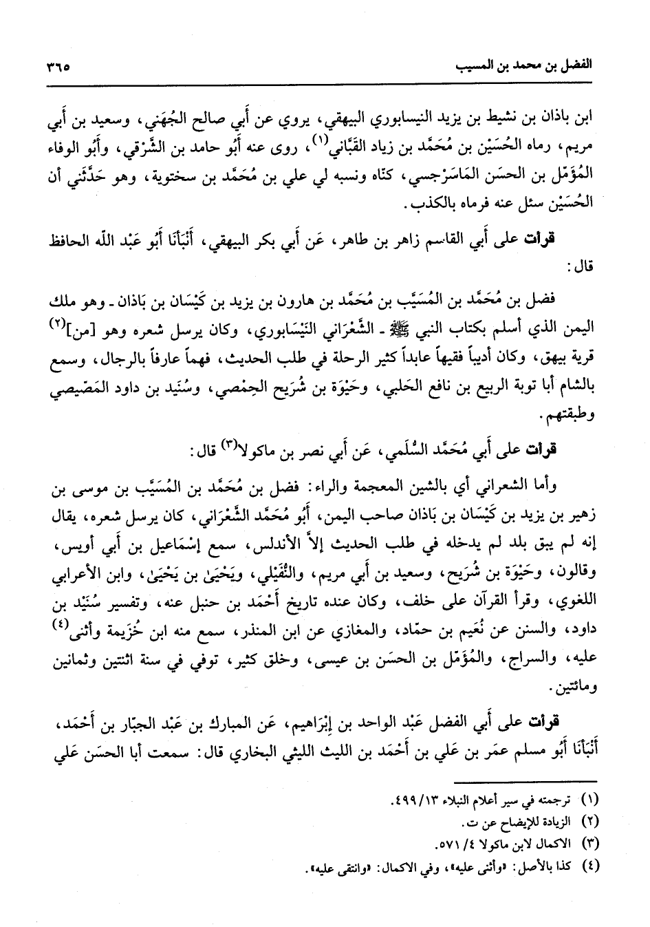 ابن باذان بن نشيط بن يزيد النيسابوري البيهقي يروي عن أبي صالح الجهني وسعيد بن أبي مريم رماه الحسين بن محمد بن زياد القباني (1) روى عنه أبو حامد بن الشرقي وأبو الوفاء المؤمل بن الحسن الماسرجسي كناه ونسبه لي علي بن محمد بن سختوية وهو حدثني أن الحسين سئل عنه فرماه بالكذب قرأت على أبي القاسم زاهر بن طاهر عن أبي بكر البيهقي أنبأنا أبو عبد الله الحافظ قال فضل بن محمد بن المسيب بن محمد بن هارون بن يزيد بن كيسان بن باذان وهو ملك اليمن الذي أسلم بكتاب النبي (صلى الله عليه وسلم) الشعراني النيسابوري وكان يرسل شعره وهو من (2) قرية بيهق وكان أديبا فقيها عابدا كثير الرحلة في طلب الحديث فهما عارفا بالرجال وسمع بالشام أبا توبة الربيع بن نافع الحلبي وحيوة بن شريح الحمصي وسنيد بن داود المصيصي وطبقتهم قرأت على أبي محمد السلمي عن أبي نصر بن ماكولا (3) قال وأما الشعراني أي بالشين المعجمة والراء فضل بن محمد بن المسيب بن موسى بن زهير بن يزيد بن كيسان بن باذان صاحب اليمن أبو محمد الشعراني كان يرسل شعره يقال إنه لم يبق بلد لم يدخله في طلب الحديث إلا الأندلس سمع إسماعيل بن أبي أويس وقالون وحيوة بن شريح وسعيد بن أبي مريم والنفيلي ويحيى بن يحيى وابن الأعرابي اللغوي وقرأ القرآن على خلف وكان عنده تاريخ أحمد بن حنبل عنه وتفسير سنيد بن داود والسنن عن نعيم بن حماد والمغازي عن ابن المنذر سمع منه ابن خزيمة وأثنى (4) عليه والسراج والمؤمل بن الحسن بن عيسى وخلق كثير توفي في سنة اثنتين وثمانين ومائتين قرأت على أبي الفضل عبد الواحد بن إبراهيم عن المبارك بن عبد الجبار بن أحمد أنبأنا أبو مسلم عمر بن علي بن أحمد بن الليث الليثي البخاري قال سمعت أبا الحسن علي