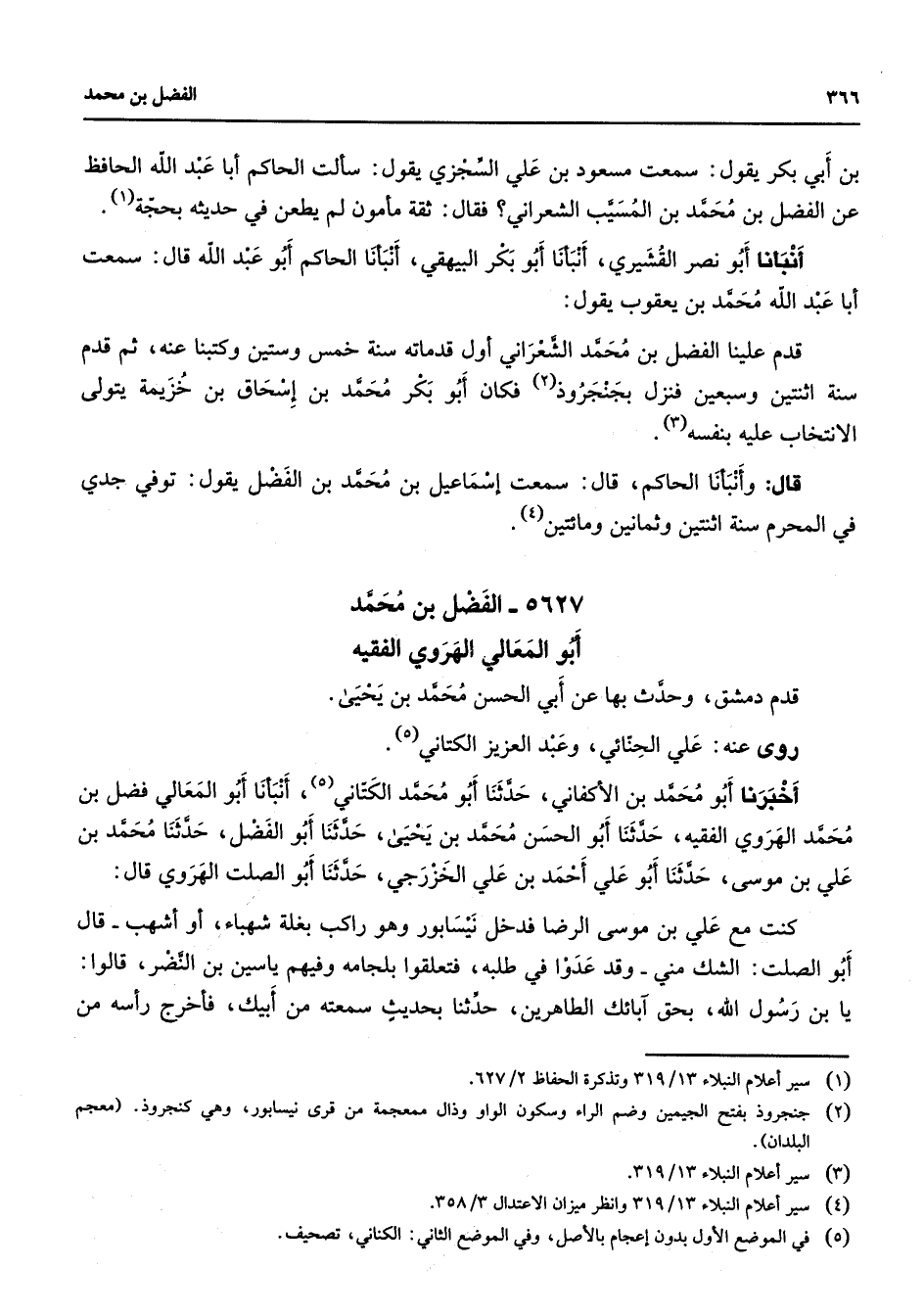 5627 - الفضل بن محمد أبو المعالي الهروي الفقيه قدم دمشق وحدث بها عن أبي الحسن محمد بن يحيى روى عنه علي الحنائي وعبد العزيز الكتاني (5) أخبرنا أبو محمد بن الأكفاني حدثنا أبو محمد الكتاني (5) أنبأنا أبو المعالي فضل بن محمد الهروي الفقيه حدثنا أبو الحسن محمد بن يحيى حدثنا أبو الفضل حدثنا محمد بن علي بن موسى حدثنا أبو علي أحمد بن علي الخزرجي حدثنا أبو الصلت الهروي قال كنت مع علي بن موسى الرضا فدخل نيسابور وهو راكب بغلة شهباء أو أشهب قال أبو الصلت الشك مني وقد عدوا في طلبه فتعلقوا بلجامه وفيهم ياسين بن النضر قالوا يابن رسول الله بحق آبائك الطاهرين حدثنا بحديث سمعته من أبيك فأخرج رأسه من