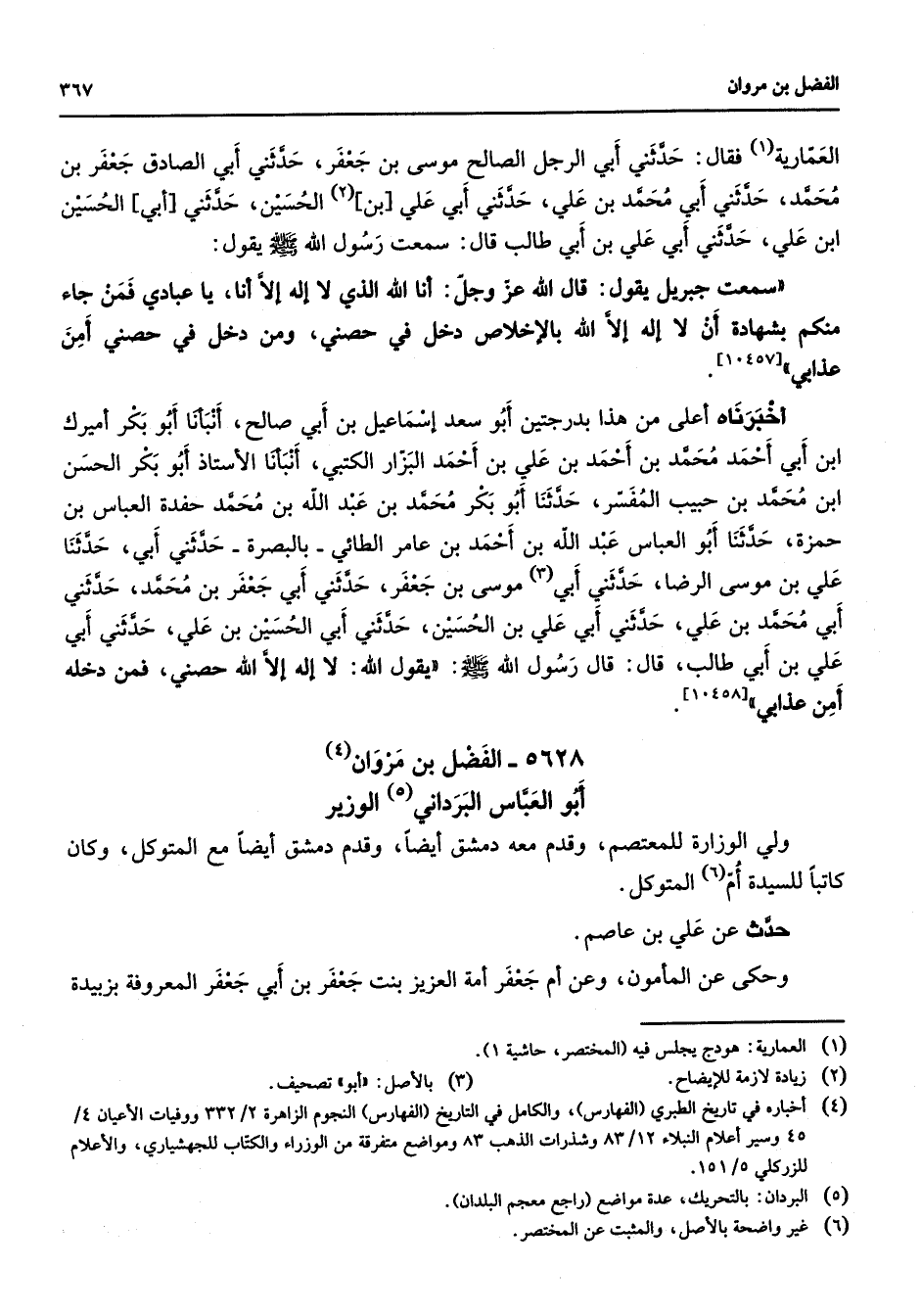5628 - الفضل بن مروان (4) أبو العباس البرداني (5) الوزير ولي الوزارة للمعتصم وقدم معه دمشق أيضا وقدم دمشق أيضا مع المتوكل وكان كاتبا للسيدة أم (6) المتوكل حدث عن علي بن عاصم وحكى عن المأمون وعن أم جعفر أمة العزيز بنت جعفر بن أبي جعفر المعروفة بزبيدة
