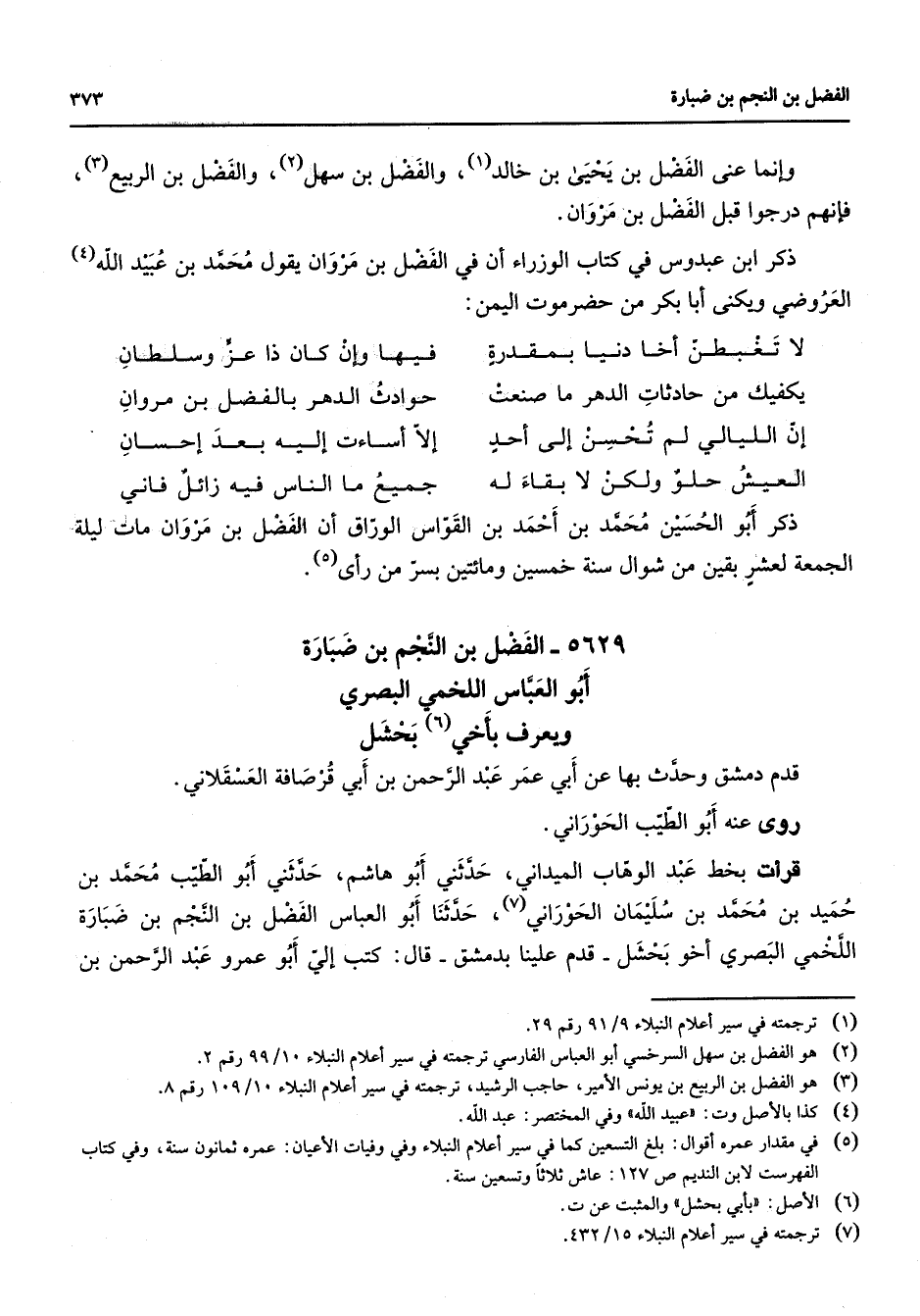 5629 - الفضل بن النجم بن ضبارة أبو العباس اللخمي البصري ويعرف بأخي (6) بحشل قدم دمشق وحدث بها عن أبي عمر عبد الرحمن بن أبي قرصافة العسقلاني روى عنه أبو الطيب الحوراني قرأت بخط عبد الوهاب الميداني حدثني أبو هاشم حدثني أبو الطيب محمد بن حميد بن محمد بن سليمان الحوراني (7) حدثنا أبو العباس الفضل بن النجم بن ضبارة اللخمي البصري أخو بحشل قدم علينا بدمشق قال كتب إلي عمرو عبد الرحمن بن