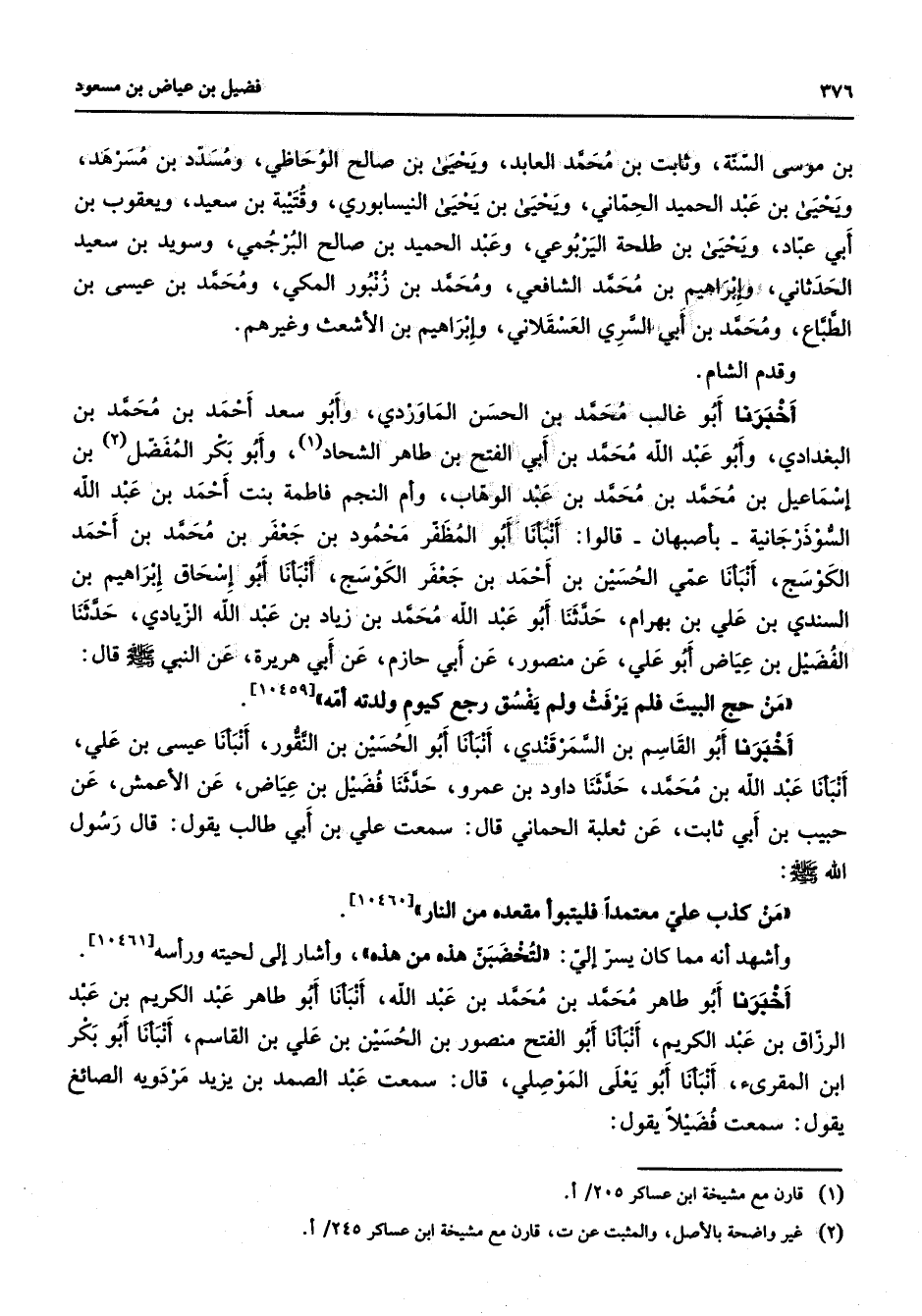 بن موسى السنة وثابت بن محمد العابد ويحيى بن صالح الوحاظي ومسدد بن مسرهد ويحيى بن عبد الحميد الحماني ويحيى بن يحيى النيسابوري وقتيبة بن سعيد ويعقوب بن أبي عباد ويحيى بن طلحة اليربوعي وعبد الحميد بن صالح البرجمي وسويد بن سعيد الحدثاني وإبراهيم بن محمد الشافعي ومحمد بن زنبور المكي ومحمد بن عيسى بن الطباع ومحمد ابن أبي السري العسقلاني وإبراهيم بن الأشعث وغيرهم وقدم الشام أخبرنا أبو غالب محمد بن الحسن الماوردي وأبو سعد أحمد بن محمد بن البغدادي وأبو عبد الله محمد بن أبي الفتح بن طاهر الشحاد () وأبو بكر المفضل (2) بن إسماعيل بن محمد بن محمد بن عبد الوهاب وأم النجم فاطمة بنت أحمد بن عبد الله السوذرجانية بأصبهان قالوا أنبأنا أبو المظفر محمود بن جعفر بن محمد بن أحمد الكوسج أنبأنا عمي الحسين بن أحمد بن جعفر الكوسج أنبأنا أبو إسحاق إبراهيم بن السندي بن علي بن بهرام حدثنا أبو عبد الله محمد بن زياد بن عبد الله الزيادي حدثنا الفضيل بن عياض أبو علي عن منصور عن أبي حازم عن أبي هريرة عن النبي (صلى الله عليه وسلم) قال من حج البيت فلم يرفث ولم يفسق وجع كيوم ولدته أمه أخبرنا أبو القاسم بن السمرقندي أنبأنا أبو الحسين بن النقور أنبأنا عيسى بن علي أنبأنا عبد الله بن محمد حدثنا داود بن عمرو حدثنا فضيل بن عياض عن الأعمش عن حبيب بن أبي ثابت عن ثعلبة الحماني قال سمعت علي بن أبي طالب يقول قال رسول الله (صلى الله عليه وسلم) من كذب علي معتمدا فليتبوأ مقعده من النار وأشهد أنه مما كان يسر إلي لتخضبن هذه من هذه وأشار إلى لحيته ورأسه أخبرنا أبو طاهر محمد بن محمد بن عبد الله أنبأنا أبو طاهر عبد الكريم بن عبد الرزاق بن عبد الكريم أنبأنا أبو الفتح منصور بن الحسين بن علي بن القاسم أنبأنا أبو بكر ابن المقرئ أنبأنا أبو يعلى الموصلي قال سمعت عبد الصمد بن يزيد مردوية الصائغ يقول سمعت فضيلا يقول