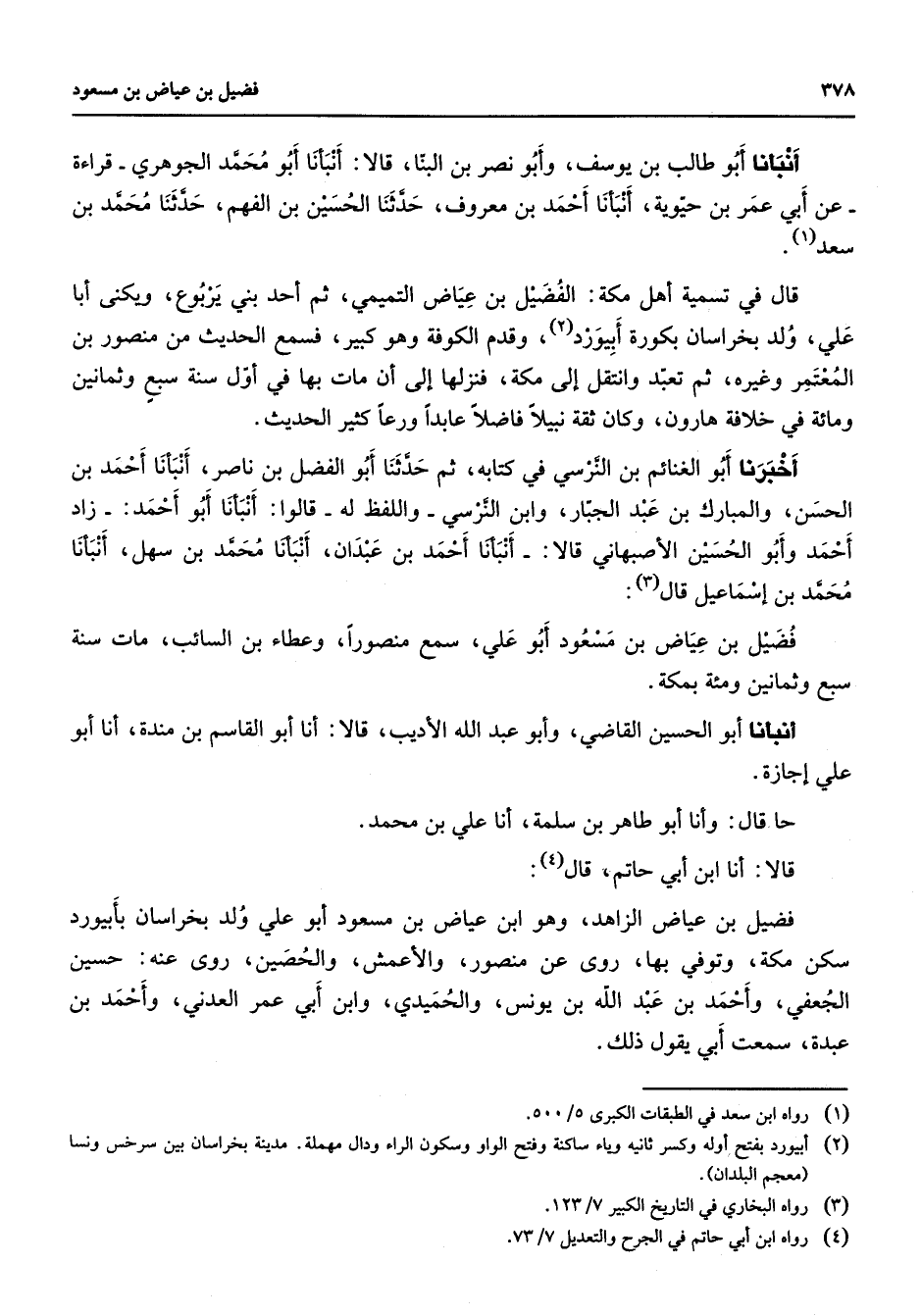 أنبأنا أبو طالب بن يوسف وأبو نصر بن البنا قالا أنبأنا أبو محمد الجوهري قراءة عن أبي عمر بن حيوية أنبأنا أحمد بن معروف حدثنا الحسين بن الفهم حدثنا محمد بن سعد (1) قال في تسمية أهل مكة الفضيل بن عياض التميمي ثم أحد بني يربوع ويكنى أبا علي ولد بخراسان بكورة أبيورد (2) وقدم الكوفة وهو كبير فسمع الحديث من منصور بن المعتمر وغيره ثم تعبد وانتقل إلى مكة فنزلها إلى أن مات بها في أول سنة سبع وثمانين ومائة في خلافة هارون وكان ثقة نبيلا فاضلا عابدا ورعا كثير الحديث أخبرنا أبو الغنائم بن النرسي في كتابه ثم حدثنا أبو الفضل بن ناصر أنبأنا أحمد بن الحسن والمبارك بن عبد الجبار وابن النرسي واللفظ له قالوا أنبأنا أبو أحمد زاد أحمد وأبو الحسين الأصبهاني قالا أنبأنا أحمد بن عبدان أنبأنا محمد بن سهل أنبأنا محمد بن إسماعيل قال (3) فضيل بن عياض بن مسعود أبو علي سمع منصورا وعطاء بن السائب مات سنة سبع وثمانين ومئة بمكة أنبأنا أبو الحسين القاضي وأبو عبد الله الأديب قالا أنا أبو القاسم بن مندة أنا أبو علي إجازة حا قال وأنا أبو طاهر بن سلمة أنا علي بن محمد قالا أنا ابن أبي حاتم قال (4) فضيل بن عياض الزاهد وهو ابن عياض بن مسعود أبو علي ولد بخراسان بأبيورد سكن مكة وتوفي بها روى عن منصور والأعمش والحصين روى عنه حسين الجعفي وأحمد بن عبد الله بن يونس والحميدي وابن أبي عمر العدني وأحمد بن عبدة سمعت أبي يقول ذلك