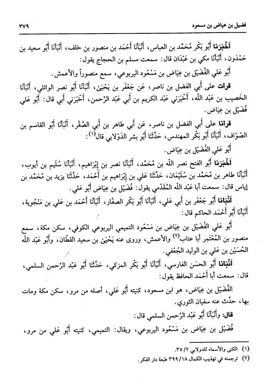 أخبرنا أبو بكر محمد بن العباس أنبأنا أحمد بن منصور بن خلف أنبأنا أبو سعيد بن حمدون أنبأنا مكي بن عبدان قال سمعت مسلم بن الحجاج يقول أبو علي الفضيل بن عياض بن مسعود اليربوعي سمع منصورا والأعمش قرأت على أبي الفضل بن ناصر عن جعفر بن يحيى أنبأنا أبو نصر الوائلي أنبأنا الخصيب بن عبد الله أخبرني عبد الكريم بن أبي عبد الرحمن أخبرني أبي قال أبو علي فضيل بن عياض قرأنا على أبي الفضل بن ناصر عن أبي طاهر بن أبي الصقر أنبأنا أبو القاسم بن الصواف أنبأنا أبو بكر المهندس حدثنا أبو بشر الدولابي قال (1) أبو علي الفضيل بن عياض أخبرنا أبو الفتح نصرالله بن محمد أنبأنا نصر بن إبراهيم أنبأنا سليم بن أيوب أنبأنا طاهر بن محمد بن سليمان حدثنا علي بن إبراهيم بن أحمد حدثنا يزيد بن محمد بن إياس قال سمعت أبا عبد الله المقدمي يقول فضيل بن عياض أبو علي أنبأنا أبو جعفر بن أبي علي أنبأنا أبو بكر الصفار أنبأنا أحمد بن علي بن منجوية أنبأنا أبو أحمد الحاكم قال أبو علي الفضيل بن عياض بن مسعود التميمي اليربوعي الكوفي سكن مكة سمع منصور بن المعتمر أبا عتاب (2) والأعمش وروى عنه يحيى بن سعيد القطان وأبو عبد الله الحسين بن علي بن الوليد الجعفي أنبأنا أبو الحسن الفارسي أنبأنا أبو بكر المزكي حدثنا أبو عبد الرحمن السلمي قال سمعت أبا أحمد الحافظ يقول الفضيل بن عياض هو ابن مسعود كنيته أبو علي أصله من مرو سكن مكة ومات بها حدث عنه سفيان الثوري قال وأنبأنا أبو عبد الرحمن السلمي قال فضيل بن عياض بن مسعود اليربوعي ويقال التميمي كنيته أبو علي من مرو
