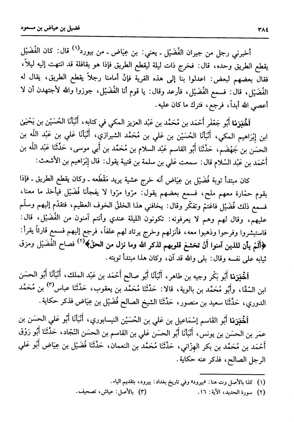 أخبرني رجل من جيران الفضيل يعني بن عياض من بيورد (1) قال كان الفضيل يقطع الطريق وحده قال فخرج ذات ليلة ليقطع الطريق فإذا هو بقافلة قد انتهت إليه ليلا فقال بعضهم لبعض اعدلوا بنا إلى هذه القرية فإن أمامنا رجلا يقطع الطريق يقال له الفضيل قال فسمع الفضيل فأرعد وقال يا قوم أنا الفضيل جوزوا والله لأجتهدن أن لا أعصي الله أبدا فرجعفترك ما كان عليه أخبرنا أبو جعفر أحمد بن محمد بن عبد العزيز المكي في كتابه أنبأنا الحسين بن يحيى ابن إبراهيم المكي أنبأنا الحسين بن علي بن محمد الشيرازي أنبأنا علي بن عبد الله بن الحسن بن جهضم حدثنا أبو القاسم عبد السلام بن محمد بن أبي موسى حدثنا عبد الله بن أحمد بن عبد السلام قال سمعت علي بن سلمة بن قتيبة يقول قال إبراهيم بن الأشعث كان مبتدأ توبة فضيل بن عياض أنه خرج عشية يريد مقطعه وكان يقطع الطريق فإذا بقوم حمارة معهم ملح فسمع بعضهم يقول مروا مروا لا يفجأنا فضيل فيأخذ ما معنا فسمع ذلك فضيل فاغتم وتفكر وقال يخافني هذا الخلق الخوف العظيم فتقدم إليهم وسلم عليهم وقال لهم وهم لا يعرفونه تكونون الليلة عندي وأنتم آمنون من الفضيل قال فاستبشروا وفرحوا وذهبوا معه فأنزلهم وخرج يرتاد لهم علفا فرجع إليهم فسمع قارئا يقرأ " ألم يأن للذين آمنوا أن تخشع قلوبهم لذكر الله وما نزل من الحق (2) " فصاح الفضيل ومزق ثيابه على نفسه وقال بلى والله قد آن وكان هذا مبتدأ توبته أخبرنا أبو بكر وجيه بن طاهر أنبأنا أبو صالح أحمد بن عبد الملك أنبأنا أبو الحسن ابن السقا وأبو محمد بن بالوية قالا حدثنا محمد بن يعقوب حدثنا عباس (3) بن محمد الدوري حدثنا سعيد بن منصور حدثنا الشيخ الصالح فضيل بن عياض فذكر حكاية أخبرنا أبو القاسم إسماعيل بن علي بن الحسين النيسابوري أنبأنا أبو علي الحسن بن عمر بن الحسن بن يونس أنبأنا أبو الحسن علي بن القاسم بن الحسن النجاد حدثنا أبو روق أحمد بن محمد بن بكر الهزاني حدثنا محمد بن النعمان حدثنا فضيل بن عياض أبو علي الرجل الصالح فذكر عنه حكاية