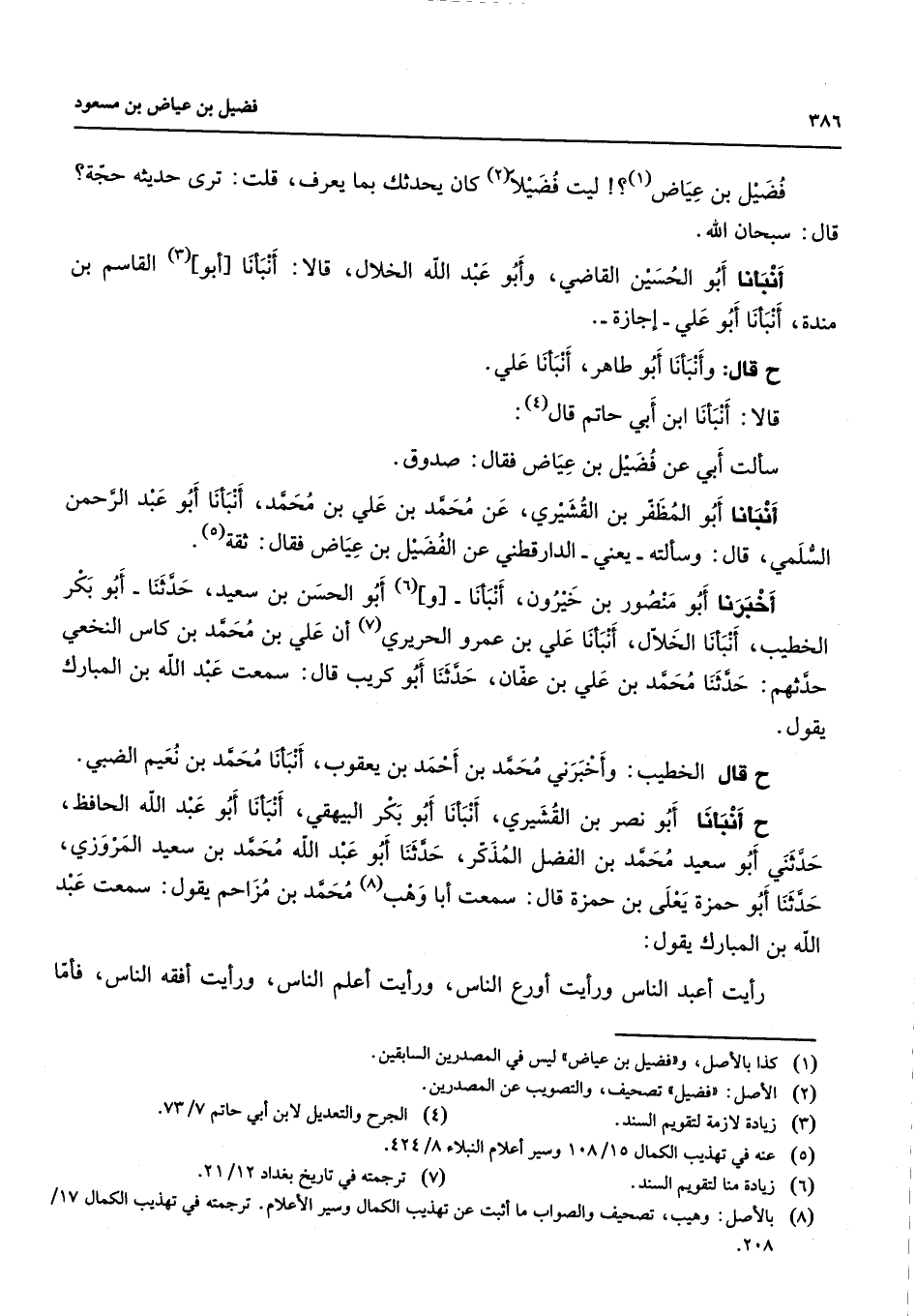 فضيل بن عياض (1) ليت فضيلا (2) كان يحدثك بما يعرف قلت ترى حديثه حجة قال سبحان الله أنبأنا أبو الحسين القاضي وأبو عبد الله الخلال قالا أنبأنا أبو (3) القاسم بن مندة أنبأنا أبو علي إجازة ح قال وأنبأنا أبو طاهر أنبأنا علي قالا أنبأنا ابن أبي حاتم قال (4) سألت أبي عن فضيل بن عياض فقال صدوق أنبأنا أبو المظفر بن القشيري عن محمد بن علي بن محمد أنبأنا أبو عبد الرحمن السلمي قال وسألته يعني الدراقطني عن الفضيل بن عياض فقال ثقة (5) أخبرنا أبو منصور بن خيرون أنبأنا و (6) أبو الحسن بن سعيد حدثنا أبو بكر الخطيب أنبأنا الخلال أنبأنا علي بن عمرو الحريري (7) أن علي بن محمد بن كاس النخعي حدثهم حدثنا محمد بن علي بن عفان حدثنا أبو كريب قال سمعت عبد الله بن المبارك يقول ح قال الخطيب وأخبرني محمد بن أحمد بن يعقوب أنبأنا محمد بن نعيم الضبي ح أنبأنا أبو نصر بن القشيري أنبأنا أبو بكر البيهقي أنبأنا أبو عبد الله الحافظ حدثني أبو سعيد محمد بن الفضل المذكر حدثنا أبو عبد الله محمد بن سعيد المروزي حدثنا أبو حمزة يعلى بن حمزة قال سمعت أبا وهب (8) محمد بن مزاحم يقول سمعت عبد الله بن المبارك يقول رأيت أعبد الناس ورأيت أورع الناس ورأيت أعلم الناس ورأيت أفقه الناس فأما