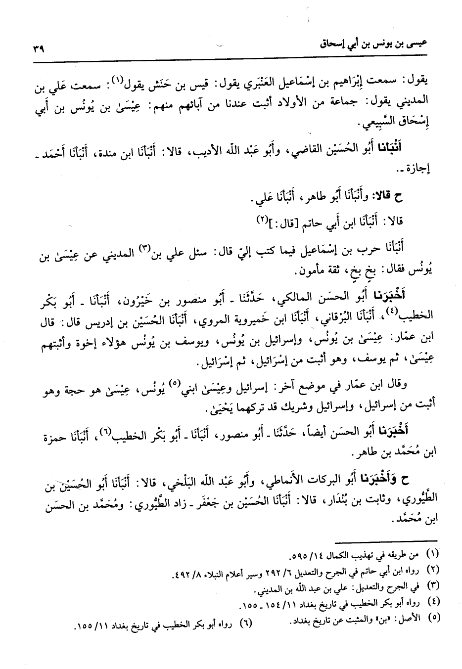يقول سمعت إبراهيم بن إسماعيل العنبري يقول قيس بن حنش يقول (1) سمعت علي بن المديني يقول جماعة من الأولاد أثبت عندنا من آبائهم منهم عيسى بن يونس بن أبي إسحاق السبيعي أنبأنا أبو الحسين القاضي وأبو عبد الله الأديب قالا أنبأنا ابن مندة أنبأنا أحمد إجازة ح قالا وأنبأنا أبو طاهر أنبأنا علي قالا أنبأنا ابن أبي حاتم قال (2) أنبأنا حرب بن إسماعيل فيما كتب إلي قال سئل علي بن (3) المديني عن عيسى بن يونس فقال بخ بخ ثقة مأمون أخبرنا أبو الحسن المالكي حدثنا أبو منصور بن خيرون أنبأنا أبو بكر الخطيب أنبأنا البرقاني أنبأنا ابن خميروية المروي أنبأنا الحسين بن إدريس قال قال ابن عمار عيسى بن يونس وإسرائيل بن يونس ويوسف بن يونس هؤلاء إخوة وأثبتهم عيسى ثم يوسف وهو أثبت من إسرائيل ثم إسرائيل وقال ابن عمار في موضع آخر إسرائيل وعيسى ابني (5) يونس عيسى هو حجة وهو أثبت من إسرائيل وإسرائيل وشريك قد تركهما يحيى أخبرنا أبو الحسن أيضا حدثنا أبو منصور أنبأنا أبو بكر الخطيب (6) أنبأنا حمزة ابن محمد بن طاهر ح وأخبرنا أبو البركات الأنماطي وأبو عبد الله البلخي قالا أنبأنا أبو الحسين بن الطيوري وثابت بن بندار قالا أنبأنا الحسين بن جعفر زاد الطيوري ومحمد بن الحسن ابن محمد