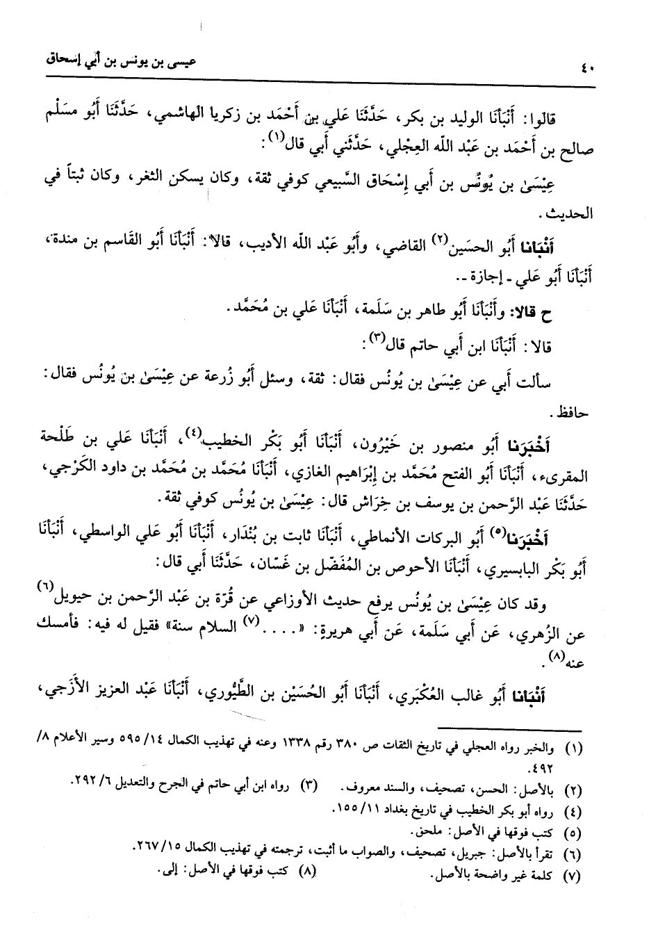 قالوا أنبأنا الوليد بن بكر حدثنا علي بن أحمد بن زكريا الهاشمي حدثنا أبو مسلم صالح بن أحمد بن عبد الله العجلي حدثني أبي قال (1) عيسى بن يونس بن أبي إسحاق السبيعي كوفي ثقة وكان يسكن الثغر وكان ثبتا في الحديث أنبأنا أبو الحسين (2) القاضي وأبو عبد الله الأديب قالا أنبأنا أبو القاسم بن مندة أنبأنا أبو علي إجازة ح قالا وأنبأنا أبو طاهر بن سلمة أنبأنا علي بن محمد قالا أنبأنا ابن أبي حاتم قال (3) سألت أبي عن عيسى بن يونس فقال ثقة وسئل أبو زرعة عن عيسى بن يونس فقال حافظ أخبرنا أبو منصور بن خيرون أنبأنا أبو بكر الخطيب (4) أنبأنا علي بن طلحة المقرئ أنبأنا أبو الفتح محمد بن إبراهيم الغازي أنبأنا محمد بن محمد بن داود الكرجي حدثنا عبد الرحمن بن يوسف بن خراش قال عيسى بن يونس كوفي ثقة أخبرنا (5) أبو البركات الأنماطي أنبأنا ثابت بن بندار أنبأنا أبو علي الواسطي أنبأنا أبو بكر البابسيري أنبأنا الأحوص بن المفضل بن غسان حدثنا أبي قال وقد كان عيسى بن يونس يرفع حديث الأوزاعي عن قرة بن عبد الرحمن بن حيويل (6) عن الزهري عن أبي سلمة عن أبي هريرة (7) السلام سنة فقيل له فيه فامسك عنه (8) أنبأنا أبو غالب العكبري أنبأنا أبو الحسين بن الطيوري أنبأنا عبد العزيز الأزجي