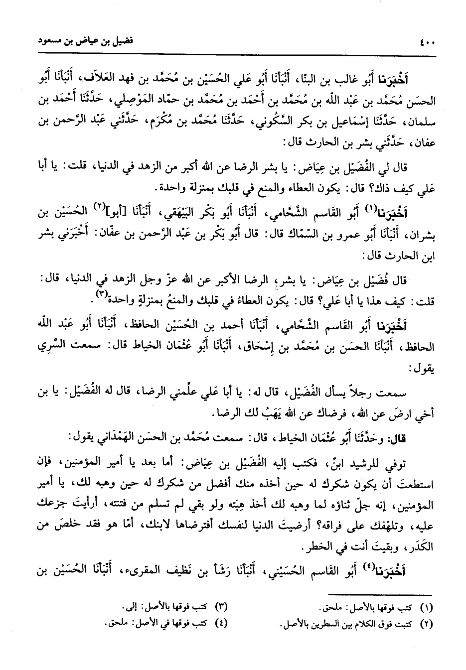 أخبرنا أبو غالب بن البنا أنبأنا أبو علي الحسين بن محمد بن فهد العلاف أنبأنا أبو الحسن محمد بن عبد الله بن محمد بن أحمد بن محمد بن حماد الموصلي حدثنا أحمد بن سلمان حدثنا إسماعيل بن بكر السكوني حدثنا محمد بن مكرم حدثني عبد الرحمن بن عفان حدثني بشر بن الحارث قال قال لي الفضيل بن عياض يا بشر الرضا عن الله أكبر من الزهد في الدنيا قلت يا أبا علي كيف ذاك قال يكون العطاء والمنع في قلبك والمنع بمنزلة واحدة أخبرنا (1) أبو القاسم الشحامي أنبأنا أبو بكر البيهقي أنبأنا أبو (2) الحسين بن بشران أنبأنا أبو عمرو بن السماك قال قال أبو بكر بن عبد الرحمن بن عفان اخبرني بشر ابن الحارث قال قال فضيل بن عياض يا بشر الرضا الاكبر عن الله عز وجل الزهد في الدنيا قال قلت كيف هذا يا ابا علي قال يكون العطاء في قلبك والمنع بمنزلة واحدة (3) اخبرنا أبو القاسم الشحامي أنبأنا أحمد بن الحسين الحافظ أنبأنا أبو عبد الله الحافظ أنبأنا الحسن بن محمد بن إسحاق أنبأنا أبو عثمان الخياط قال سمعت السري يقول سمعت رجلا يسأل الفضيل قال له يا أبا علي علمني الرضا قال له الفضيل يا بن أخي ارض عن الله فرضاك عن الله يهب لك الرضا قال وحدثنا أبو عثمان الخياط قال سمعت محمد بن الحسن الهمداني يقول توفي للرشيد ابن فكتب إليه الفضيل بن عياض أما بعد يا أمير المؤمنين فإن استطعت أن يكون شكرك له حين أخذه منك أفضل من شكرك له حين وهبه لك يا أمير المؤمنين إنه جل ثناؤه لما وهبه لك أخذ هبته ولو بقي لم تسلم من فتنته أرأيت جزعك عليه وتلهفك على فراقه أرضيت الدنيا لنفسك أفترضاها لابنك أما هو فقد خلص من الكدر وبقيت أنت في الخطر أخبرنا (4) أبو القاسم الحسيني أنبأنا رشأ بن نظيف المقرئ أنبأنا الحسين بن