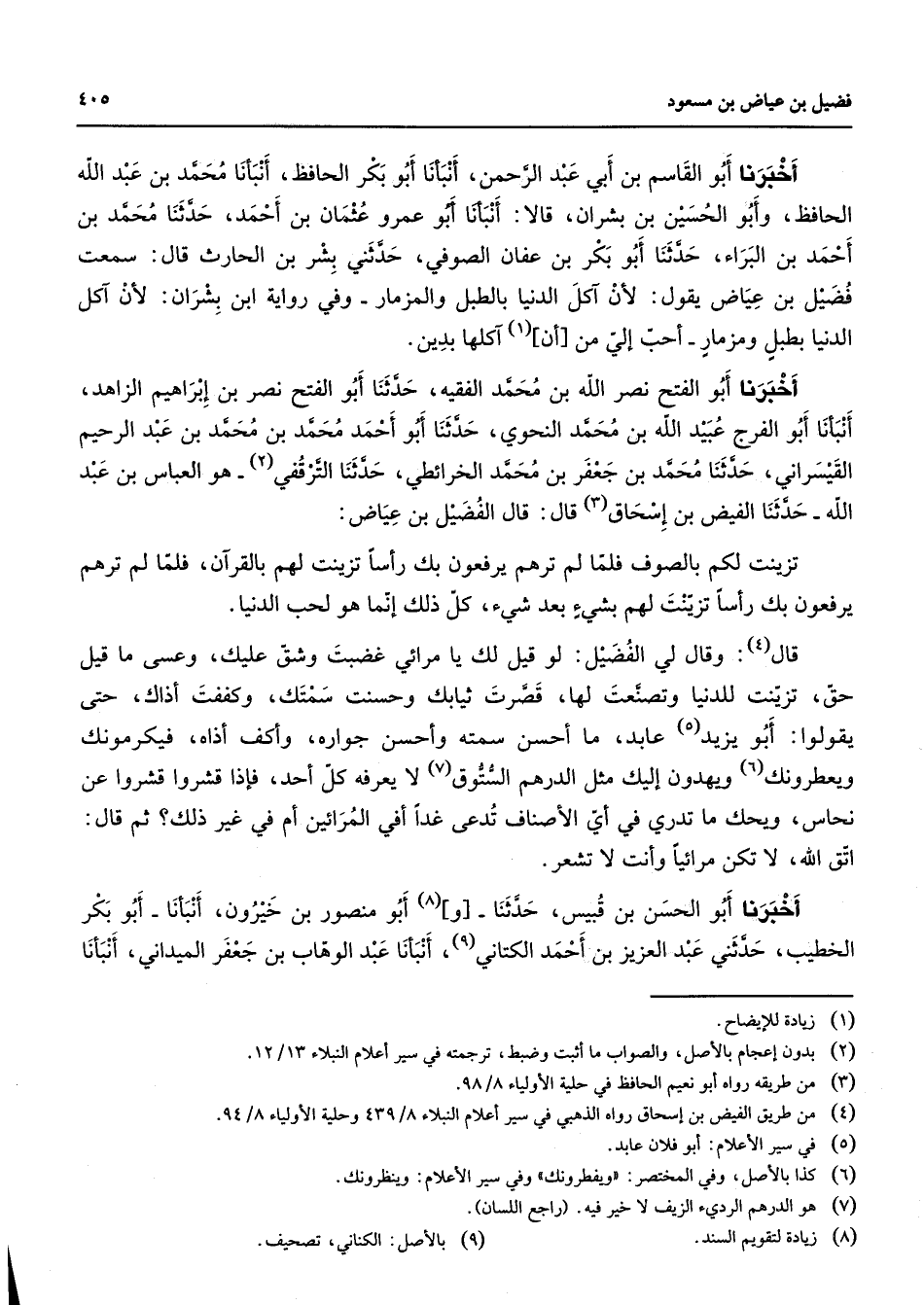 أخبرنا أبو القاسم بن أبي عبد الرحمن أنبأنا أبو بكر الحافظ أنبأنا محمد بن عبد الله الحافظ وأبو الحسين بن بشران قالا أنبأنا أبو عمرو عثمان بن أحمد حدثنا محمد بن أحمد بن البراء حدثنا أبو بكر بن عفان الصوفي حدثني بشر بن الحارث قال سمعت فضيل بن عياض يقول لأن آكل الدنيا بالطبل والمزمار وفي رواية ابن بشران لأن آكل الدنيا بطبل ومزمار أحب إلي من أن (1) آكلها بدين أخبرنا أبو الفتح نصرالله بن محمد الفقيه حدثنا أبو الفتح نصر بن إبراهيم الزاهد أنبأنا أبو الفرج عبيد الله بن محمد النحوي حدثنا أبو أحمد محمد بن محمد بن عبد الرحيم القيسراني حدثنا محمد بن جعفر بن محمد الخرائطي حدثنا الترقفي (2) هو العباس بن عبد الله حدثنا الفياض بن إسحاق (3) قال قال الفضيل بن عياض تزينت لكم بالصوف فلما لم ترهم يرفعون بك رأسا تزينت لهم بالقرآن فلما لم ترهم يرفعون بك رأسا تزينت لهم بشئ بعد شئ كل ذلك إنما هو لحب الدنيا قال (4) وقال لي الفضيل لو قيل لك يا مرائي غضبت وشق عليك وعسى ما قيل حق تزينت للدنيا وتصنعت لها قصرت ثيابك وحسنت سمتك وكففت أذاك حتى يقولوا أبو يزيد (5) عابد ما أحسن سمته وأحسن جواره وأكف أذاه فيكرمونك ويعطرونك (6) ويهدون إليك مثل الدرهم الستوق (7) لا يعرفه كل أحد فإذا قشروا قشروا عن نحاس ويحك ما تدري في أي الأصناف تدعى غدا أفي المرائين أم في غير ذلك ثم قال اتق الله لا تكن مرائيا وأنت لا تشعر أخبرنا أبو الحسن بن قبيس حدثنا و (8) أبو منصور بن خيرون أنبأنا أبو بكر الخطيب حدثني عبد العزيز بن أحمد الكتاني (9) أنبأنا عبد الوهاب بن جعفر الميداني أنبأنا