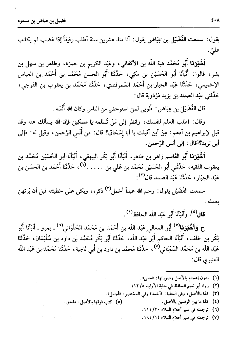 يقول سمعت الفضيل بن عياض يقول أنا منذ عشرين سنة أطلب رفيقا إذا غضب لم يكذب علي أخبرنا أبو محمد هبة الله بن الأكفاني وعبد الكريم بن حمزة وطاهر بن سهل بن بشر قالوا أنبأنا أبو الحسين بن مكي حدثنا أبو الحسن محمد بن أحمد بن العباس الإخميمي حدثنا عبد الجبار بن أحمد السمرقندي حدثنا محمد بن يعقوب بن الفرجي حدثني عبد الصمد بن يزيد مردوية قال قال الفضيل بن عياض طوبى لمن استوحش من الناس وكان الله أنسه وقال اطلب العلم لنفسك وانظر إلى من تسلمه يا مسكين فإن الله يسألك عنه وقد قيل لإبراهيم بن أدهم من أين أقبلت يا أبا إسحاق قال من أنس الرحمن وقيل له فإلى اين تريد قال إلى أنس الرحمن أخبرنا أبو القاسم زاهر بن طاهر أنبأنا أبو بكر البيهقي أنبأنا أبو الحسين محمد بن يعقوب الفقيه حدثني أبو الحسين محمد بن علي بن (1) حدثنا أحمد بن الحسن بن عبد الجبار حدثنا عبد الصمد قال (2) سمعت الفضيل يقول رحم الله عبدا أخمل (3) ذكره وبكى على خطيئته قبل أن يرتهن بعمله قال (4) وأنبأنا أبو عبد الله الحافظ ح وأخبرنا (5) أبو المعالي عبد الله بن أحمد بن محمد الحلواني (6) بمرو أنبأنا أبو بكر بن خلف أنبأنا الحاكم أبو عبد الله حدثنا أبو بكر محمد بن داود بن سلميان حدثنا عبد الله بن محمد السمناني (7) حدثنا محمد بن داود بن أبي ناحية حدثنا محمد بن عبد الله العنبري قال