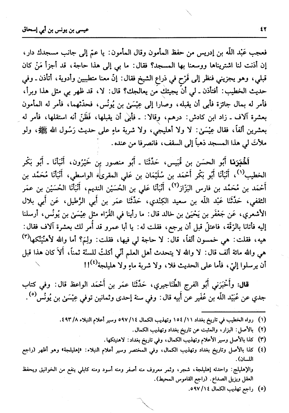 فعجب عبد الله بن إدريس من حفظ المأمون وقال المأمون يا عم إلى جانب مسجدك دار إن أذنت لنا اشتريناها ووسعنا بها المسجد فقال ما بي إلى هذا حاجة قد أجزأ من كان قبلي وهو يجزيني فنظر إلى قرح في ذراع الشيخ فقال إن معنا متطببين وأدوية أتأذن وفي حديث الخطيب أفتأذن لي أن يجيئك من يعالجك قال لا قد ظهر بي مثل هذا وبرأ فأمر له بمال جائزة فأبى أن يقبله وصارا إلى عيسى بن يونس فحدثهما فأمر له المأمون بعشرة آلاف زاد ابن كادش درهم وقالا فأبى أن يقبلها فظن أنه استقلها فأمر له بعشرين ألفا فقال عيسى لا ولا أهليجي ولا شربة ماء على حديث رسول الله (صلى الله عليه وسلم) ولو ملأت لي هذا المسجد ذهبا إلى السقف فانصرفا من عنده أخبرنا أبو الحسن بن قبيس حدثنا أبو منصور بن خيرون أنبأنا أبو بكر الخطيب (1) أنبأنا أبو بكر أحمد بن سليمان بن علي المقرئ الواسطي أنبأنا محمد بن أحمد بن محمد بن فارس البزاز (1) أنبأنا علي بن الحسين النديم أنبأنا الحسين بن عمر الثقفي حدثنا عبد الله بن سعيد الكندي حدثنا عمر بن أبي الرطيل عن أبي بلال الأشعري عن جعفر بن يحيى بن خالد قال ما رأينا في القراء مثل عيسى بن يونس أرسلنا إليه فأتانا بالرقة فاعتل قبل أن يرجع فقلت له يا أبا عمرو قد أمر لك بعشرة آلاف فقال هيه فقلت هي خمسون ألفا قال لا حاجة لي فيها فقلت ولم أما والله لأهنينكها (3) هي والله مائة الف قال لا والله لا يتحدث أهل العلم أني أكلت للسنة ثمنا ألا كان هذا قبل أن يرسلوا إلي فأما على الحديث فلا ولا شربة ماء ولا هليلجة (4) قال وأخبرني أبو الفرج الطناجيري حدثنا عمر بن أحمد الواعظ قال وفي كتاب جدي عن عبيد الله بن عفير عن أبيه قال وفي سنة إحدى وثمانين توفي عيسى بن يونس (5)