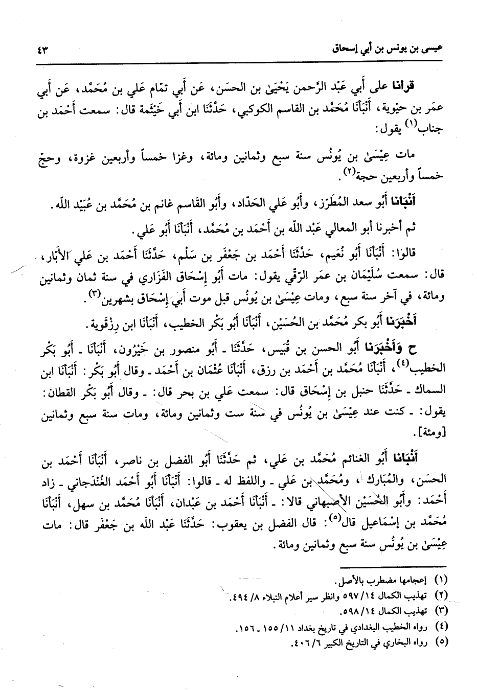 قرأنا على أبي عبد الرحمن يحيى بن الحسن عن أبي تمام علي بن محمد عن أبي عمر بن حيوية أنبأنا محمد بن القاسم الكوكبي حدثنا ابن أبي خيثمة قال سمعت أحمد بن جناب (1) يقول مات عيسى بن يونس سنة سبع وثمانين ومائة وغزا خمسا وأربعين غزوة وحج خمسا وأربعين حجة (2) أنبأنا أبو سعد المطرز وأبو علي الحداد وأبو القاسم غانم بن محمد بن عبيد الله ثم أخبرنا أبو المعالي عبد الله بن أحمد بن محمد أنبأنا أبو علي قالوا أنبأنا أبو نعيم حدثنا أحمد بن جعفر بن سلم حدثنا أحمد بن علي الأبار قال سمعت سليمان بن عمر الرقي يقول مات أبو إسحاق الفزاري في سنة ثمان وثمانين ومائة في آخر سنة سبع ومات عيسى بن يونس قبل موت أبي إسحاق بشهرين (3) أخبرنا أبو بكر محمد بن الحسين أنبأنا أبو بكر الخطيب أنبأنا ابن رزقوية ح وأخبرنا أبو الحسن بن قبيس حدثنا أبو منصور بن خيرون أنبأنا أبو بكر الخطيب (4) أنبأنا محمد بن أحمد بن رزق أنبأنا عثمان بن أحمد وقال أبو بكر أنبأنا ابن السماك حدثنا حنبل بن إسحاق قال سمعت على بن بحر قال وقال أبو بكر القطان يقول كنت عند عيسى بن يونس في سنة ست وثمانين ومائة ومات سنة سبع وثمانين ومئة أنبأنا أبو الغنائم محمد بن علي ثم حدثنا أبو الفضل بن ناصر أنبأنا أحمد بن الحسن والمبارك ومحمد بن علي واللفظ له قالوا أنبأنا أبو أحمد الغندجاني زاد أحمد وأبو الحسين الأصبهاني قالا أنبأنا أحمد بن عبدان أنبأنا محمد بن سهل أنبأنا محمد بن إسماعيل قال (5) قال الفضل بن يعقوب حدثنا عبد الله بن جعفر قال مات عيسى بن يونس سنة سبع وثمانين ومائة
