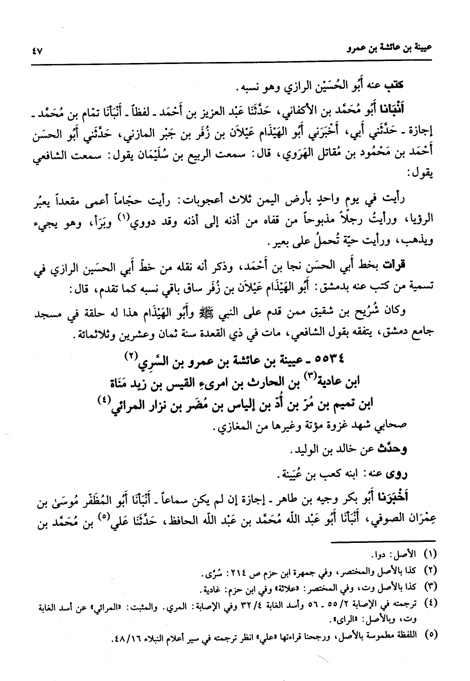 5534 - عيينة بن عائشة بن عمرو بن السري (2) ابن عادية (3) بن الحارث بن امرئ القيس بن زيد مناة ابن تميم بن مر بن أد بن إلياس بن مضر بن نزار المرائي (4) صحابي شهد غزوة مؤتة وغيرها من المغازي وحدث عن خالد بن الوليد روى عنه ابنه كعب بن عيينة أخبرنا أبو بكر وجيه بن طاهر إجازة إن لم يكن سماعا أنبأنا أبو المظفر موسى بن عمران الصوفي أنبأنا أبو عبد الله محمد بن عبد الله الحافظ حدثنا علي بن محمد بن