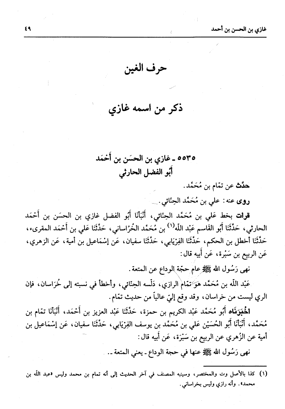 5535 - غازي بن الحسن بن أحمد أبو الفضل الحارثي حدث عن تمام بن محمد روى عنه علي بن محمد الحنائي قرأت بخط علي بن محمد الحنائي أنبأنا أبو الفضل غازي بن الحسن بن أحمد الحارثي حدثنا أبو القاسم عبد الله (1) بن محمد الخراساني حدثنا علي بن أحمد المقرئ حدثنا أخطل بن الحكم حدثنا الفريابي حدثنا سفيان عن إسماعيل بن أمية عن الزهري عن الربيع بن سبرة عن أبيه قال نهى رسول الله (صلى الله عليه وسلم) عام حجة الوداع عن المتعة عبد الله بن محمد هو تمام الرازي دلسه الحنائي وأخطأ في نسبته إلى خراسان فإن الري ليست من خراسان وقد وقع إلي عاليا من حديث تمام أخبرناه أبو محمد عبد الكريم بن حمزة حدثنا عبد العزيز بن أحمد أنبأنا تمام بن محمد أنبأنا أبو الحسين علي بن محمد بن يوسف الفريابي حدثنا سفيان عن إسماعيل بن أمية عن الزهري عن الربيع بن سبرة عن أبيه قال نهى رسول الله (صلى الله عليه وسلم) عنها في حجة الوداع يعني المتعة