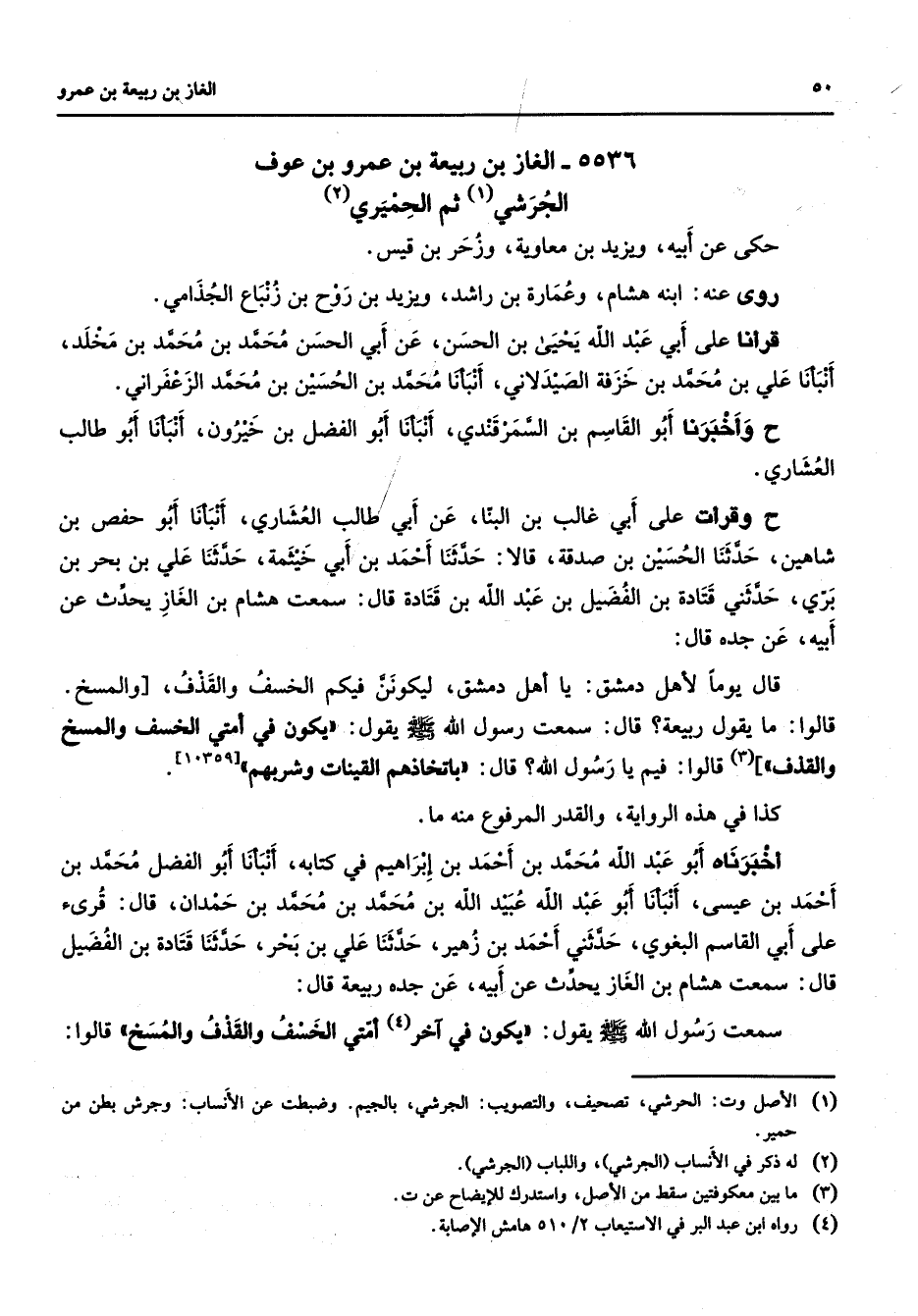 5536 - الغاز بن ربيعة بن عمرو بن عوف الجرشي (1) ثم الحميري (2) حكى عن أبيه ويزيد بن معاوية وزحر بن قيس روى عنه ابنه هشام وعمارة بن راشد ويزيد بن روح بن زنباع الجذامي قرأنا على أبي عبد الله يحيى بن الحسن عن أبي الحسن محمد بن محمد بن مخلد أنبأنا علي بن محمد بن خزفة الصيدلاني أنبأنا محمد بن الحسين بن محمد الزعفراني ح وأخبرنا أبو القاسم بن السمرقندي أنبأنا أبو الفضل بن خيرون أنبأنا أبو طالب العشاري ح وقرأت على أبي غالب بن البنا عن أبي طالب العشاري أنبأنا أبو حفص بن شاهين حدثنا الحسين بن صدقة قالا حدثنا احمد بن خيثمة حدثنا علي بن بحر بن بري حدثني قتادة بن الفضيل بن عبد الله بن قتادة قال سمعت هشام بن الغاز يحدث عن أبيه عن جده قال قال يوما لأهل دمشق يا أهل دمشق ليكونن فيكم الخسف والقذف والمسخ قالوا ما يقول ربيعة قال سمعت رسول الله (صلى الله عليه وسلم) يقول (يكون في أمتي الخسف والمسخ والقذف (3) قالوا فيم يا رسول الله قال باتخاذهم القينات وشربهم) كذا في هذه الرواية والقدر المرفوع منه ما أخبرناه أبو عبد الله محمد بن أحمد بن إبراهيم في كتابه أنبأنا أبو الفضل محمد بن أحمد بن عيسى أنبأنا أبو عبد الله عبيد الله بن محمد بن محمد بن حمدان قال قرئ على أبي القاسم البغوي حدثني أحمد بن زهير حدثنا علي بن بحر حدثنا قتادة بن الفضيل قال سمعت هشام بن الغاز يحدث عن أبيه عن جده ربيعة قال سمعت رسول الله (صلى الله عليه وسلم) يقول (يكون في آخر (4) أمتي الخسف والقذف والمسخ قالوا