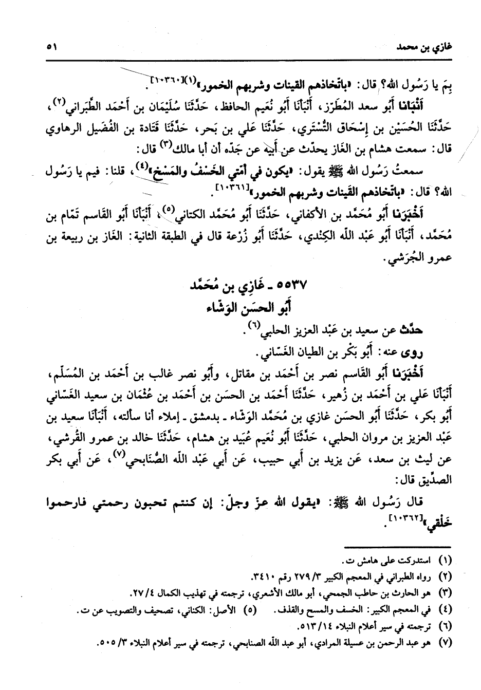 5537 - غازي بن محمد أبو الحسن الوشاء حدث عن سعيد بن عبد العزيز الحلبي (6) روى عنه أبو بكر بن الطيان الغساني أخبرنا أبو القاسم نصر بن أحمد بن مقاتل وأبو نصر غالب بن أحمد بن المسلم أنبأنا علي بن أحمد بن زهير حدثنا أحمد بن الحسن بن أحمد بن عثمان بن سعيد الغساني أبو بكر حدثنا أبو الحسن غازي بن محمد الوشاء بدمشق إملاء أنا سألته أنبأنا سعيد بن عبد العزيز بن مروان الحلبي حدثنا أبو نعيم عبيد بن هشام حدثنا خالد بن عمرو القرشي عن ليث بن سعد عن يزيد بن أبي حبيب عن أبي عبد الله الصنابحي (7) عن أبي بكر الصديق قال قال رسول الله (صلى الله عليه وسلم) (يقول الله عز وجل إن كنتم تحبون رحمتي فارحموا خلقي) "