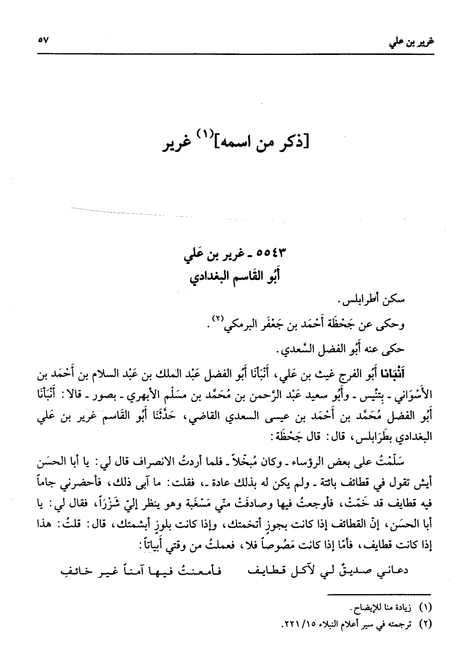 5543 - غرير بن علي أبو القاسم البغدادي سكن أطرابلس وحكى عن جحظة أحمد بن جعفر البرمكي (2) حكى عنه أبو الفضل السعدي أنبأنا أبو الفرج غيث بن علي أنبأنا أبو الفضل عبد الملك بن عبد السلام بن أحمد بن الأسواني بتنيس وأبو سعيد عبد الرحمن بن محمد بن مسلم الأبهري بصور قالا أنبأنا أبو الفضل محمد بن أحمد بن عيسى السعدي القاضي حدثنا أبو القاسم غرير بن علي البغدادي بطرابلس قال قال جحظة سلمت على بعض الرؤساء وكان مبخلا فلما أردت الإنصراف قال لي يا أبا الحسن أيش تقول في قطائف بائتة ولم يكن له بذلك عادة فقلت ما آبى ذلك فأحضرني جاما فيه قطايف قد خمت فأوجعت فيها وصادفت مني مسغبة وهو ينظر إلي شزرا فقال لي يا أبا الحسن إن القطائف إذا كانت بجوز أتخمتك وإذا كانت بلوز أبشمتك قال قلت هذا إذا كانت قطايف أما إذا كانت مصوصا فلا فعملت من وقتي أبياتا دعاني صديق لي لآكل قطايف * فأمعنت فيها آمنا غير خائف