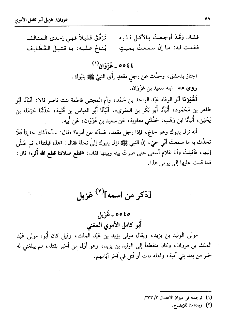 5545 - غزيل أبو كامل الأموي المغني مولى الوليد بن يزيد ويقال مولى يزيد بن عبد الملك وقيل كان أبوه مولى عبد الملك بن مروان وكان منقطعا إلى الوليد بن يزيد وهو أول من أخبر بقتله لم يبلغني له خبر من بعد بني أمية ولعله مات أو قتل في آخر أيامهم "