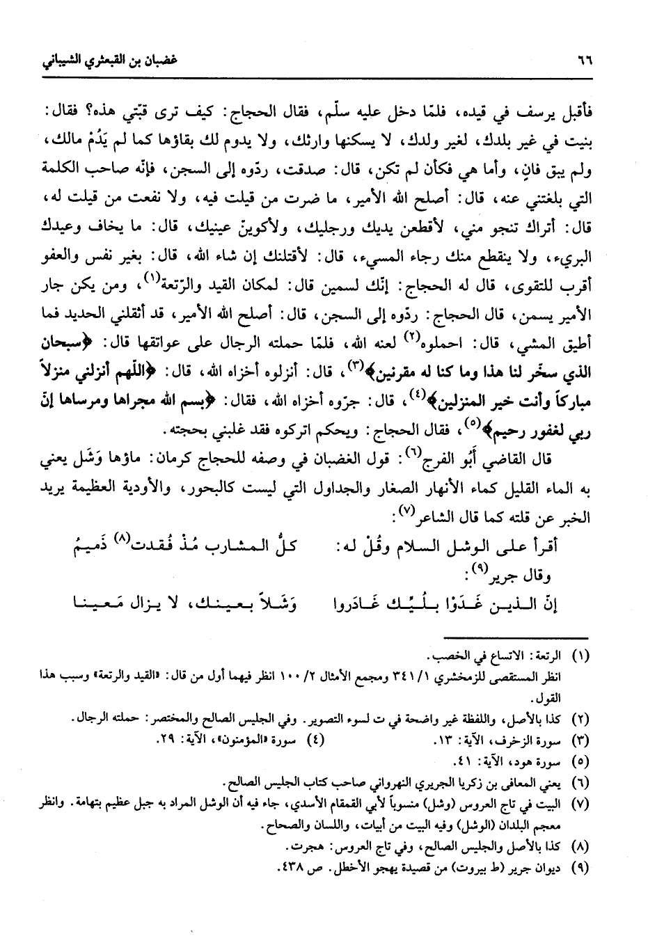فأقبل يرسف في قيده فلما دخل عليه سلم فقال الحجاج كيف ترى قبتي هذه فقال بنيت في غير بلدك لغير ولدك لا يسكنها وارثك ولا يدوم لك بقاؤها كما لم يدم مالك ولم يبق فان وأما هي فكأن لم تكن قال صدقت ردوه إلى السجن فإنه صاحب الكلمة التي بلغتني عنه قال أصلح الله الأمير ما ضرت من قيلت فيه ولا نفعت من قيلت له قال أتراك تنجو مني لأقطعن يديك ورجليك ولأكوين عينيك قال ما يخاف وعيدك البرئ ولا ينقطع منك رجاء المسئ قال لأقتلنك إن شاء الله قال بغير نفس والعفو أقرب للتقوى قال له الحجاج إنك لسمين قال لمكان القيد والرتعة (1) ومن يكن جار الأمير يسمن قال الحجاج ردوه إلى السجن قال أصلح الله الأمير قد أثقلني الحديد فما أطيق المشي قال احملوه (2) لعنه الله فلما حملته الرجال على عواتقها قال " سبحان الذي سخر لنا هذا وما كنا له مقرنين " (3) قال أنزلوه أخزاه الله قال " اللهم أنزلني منزلا مباركا وأنت خير المنزلين " (4) قال جروه أخزاه الله فقال " بسم الله مجراها ومرساها إن ربي لغفور رحيم " (5) فقال الحجاج ويحكم اتركوه فقد غلبني بحجته قال القاضي أبو الفرج (6) قول الغضبان في وصفه للحجاج كرمان ماؤها وشل يعني به الماء القليل كماء الأنهار الصغار والجداول التي ليست كالبحور والأودية العظيمة يريد الخبر عن قلته كما قال الشاعر (7) أقرأ على الوشل السلام وقل له * كل المشارب مذ فقدت (8) ذميم * وقال جرير (9) * إن الذين غدوا بليك غادروا * وشلا بعينك لا يزال معينا
