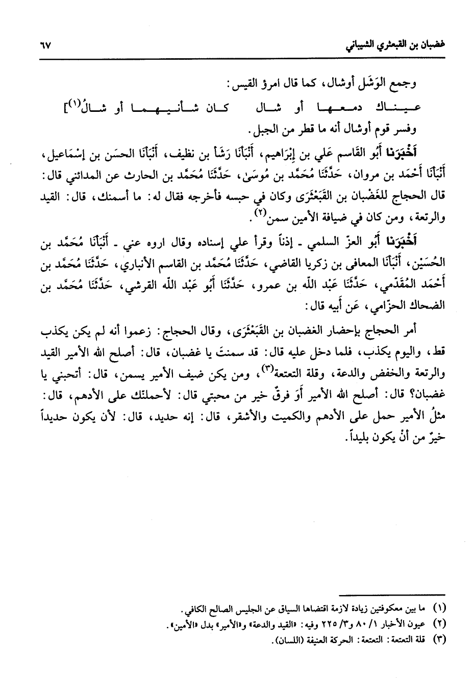 وجمع الوشل أوشال كما قال امرؤ القيس عيناك دمعها أو شال * كان شأنيهما أو شال (1) * وفسر قوم أوشال أنه ما قطر من الجبل أخبرنا أبو القاسم علي بن إبراهيم أنبأنا رشأ بن نظيف أنبأنا الحسن بن إسماعيل أنبأنا أحمد بن مروان حدثنا محمد بن موسى حدثنا محمد بن الحارث عن المدائني قال قال الحجاج للغضبان بن القبعثري ح وكان في حبسه فأخرجه فقال له ما أسمنك قال القيد والرتعة ومن كان في ضيافة الأمين سمن (2) أخبرنا أبو العز السلمي إذنا وقرأ علي إسناده وقال اروه عني أنبأنا محمد بن الحسين أنبأنا المعافى بن زكريا القاضي حدثنا محمد بن القاسم الأنباري حدثنا محمد بن أحمد المقدمي حدثنا عبد الله بن عمرو حدثنا أبو عبد الله القرشي حدثنا محمد بن الضحاك الحزامي عن أبيه قال أمر الحجاج بإحضار الغضبان بن القبعثري وقال الحجاج زعموا أنه لم يكن يكذب قط واليوم يكذب فلما دخل عليه قال سمنت يا غضبان قال أصلح الله الأمير القيد والرتعة والخفض والدعة وقلة التعتعة (3) ومن يكن ضيف الأمير يسمن قال أتحبني يا غضبان قال أصلح الله الأمير أو فرق خير من محبتي قال لأحملنك على الأدهم قال مثل الأمير حمل على الأدهم والكميت والأشقر قال إنه حديد قال لأن يكون حديدا خير من أن يكون بليدا