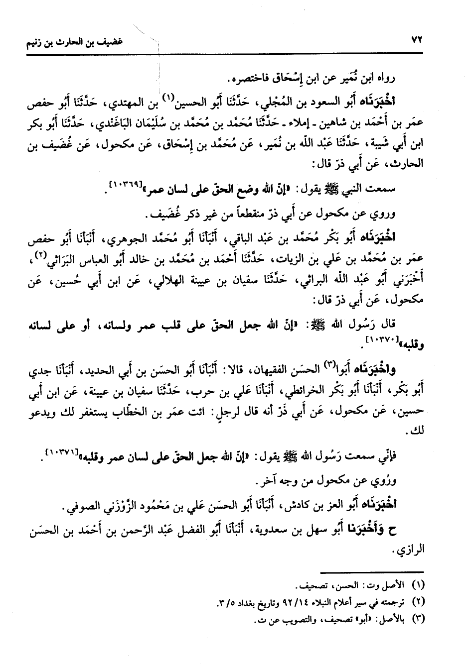 رواه ابن نمير عن ابن إسحاق فاختصره أخبرناه أبو السعود بن المجلي حدثنا أبو الحسين (1) بن المهتدي حدثنا أبو حفص عمر بن أحمد بن شاهين إملاء حدثنا محمد بن محمد بن سليمان الباغندي حدثنا أبو بكر ابن أبي شيبة حدثنا عبد الله بن نمير عن محمد بن إسحاق عن مكحول عن غضيف بن الحارث عن أبي ذر قال سمعت النبي (صلى الله عليه وسلم) يقول (إن الله وضع الحق على لسان عمر) وروي عن مكحول عن أبي ذر منقطعا من غير ذكر غضيف أخبرناه أبو بكر محمد بن عبد الباقي أنبأنا أبو محمد الجوهري أنبأنا أبو حفص عمر بن محمد بن علي بن الزيات حدثنا أحمد بن محمد بن خالد أبو العباس البراثي (2) أخبرني أبو عبد الله البراثي حدثنا سفيان بن عيينة الهلالي عن ابن أبي حسين عن مكحول عن أبي ذر قال قال رسول الله (صلى الله عليه وسلم) إن الله جعل الحق على قلب عمر ولسانه أو على لسانه وقلبه) وأخبرناه أبو (3) الحسن الفقيهان قالا أنبأنا أبو الحسن بن أبي الحديد أنبأنا جدي أبو بكر أنبأنا أبو بكر الخرائطي أنبأنا علي بن حرب حدثنا سفيان بن عيينة عن ابن أبي حسين عن مكحول عن أبي ذر أنه قال لرجل ائت عمر بن الخطاب يستغفر لك ويدعو لك فإني سمعت رسول الله (صلى الله عليه وسلم) يقول (إن الله جعل الحق على لسان عمر وقلبه) وروي عن مكحول من وجه آخر أخبرناه أبو العز بن كادش أنبأنا أبو الحسين علي بن محمود الزوزني الصوفي ح وأخبرنا أبو سهل بن سعدوية أنبأنا أبو الفضل عبد الرحمن بن أحمد بن الحسن الرازي
