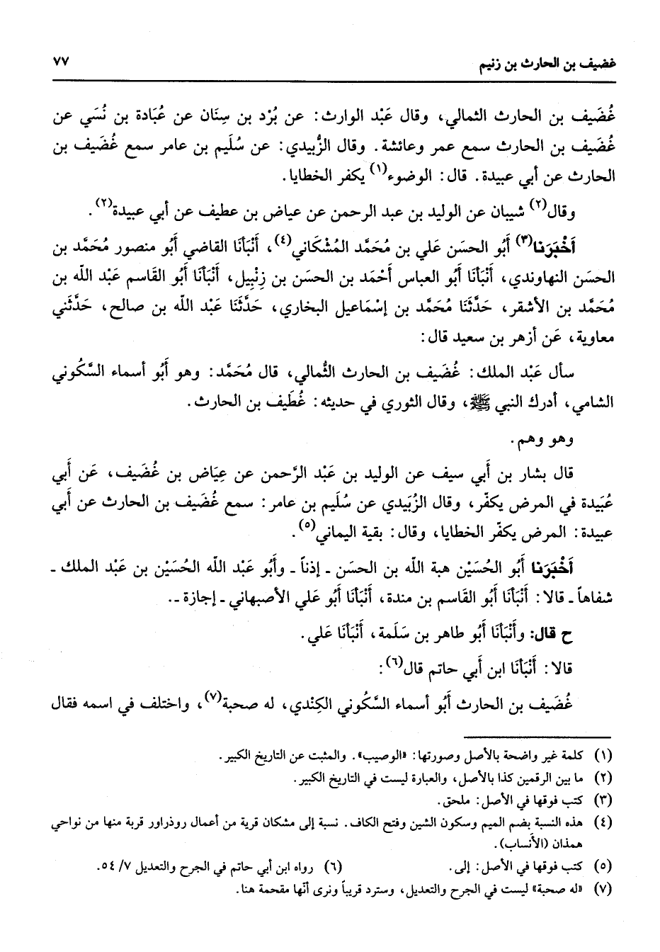 غضيف بن الحارث الثمالي وقال عبد الوارث عن برد بن سنان عن عبادة بن نسي عن غضيف بن الحارث سمع عمر وعائشة وقال الزبيدي عن سليم بن عامر سمع غضيف بن الحارث بن أبي عبيدة قال الوضوء (1) يكفر الخطايا وقال (2) شيبان عن الوليد بن عبد الرحمن عن عياض بن عطيف عن أبي عبيدة (3) أخبرنا أبو الحسن علي بن محمد المشكاني (4) أنبأنا القاضي أبو منصور محمد بن الحسن النهاوندي أنبأنا أبو العباس أحمد بن الحسن بن زنبيل أنبأنا أبو القاسم عبد الله بن محمد بن الأشقر حدثنا محمد بن إسماعيل البخاري حدثنا عبد الله بن صالح حدثني معاوية عن أزهر بن سعيد قال سأل عبد الملك غضيف بن الحارث الثمالي قال محمد وهو أبو أسماء السكوني الشامي أدرك النبي (صلى الله عليه وسلم) وقال الثوري في حديثه غضيف بن الحارث وهو وهم قال بشار بن أبي سيف عن الوليد بن عبد الرحمن عن عياض بن غضيف عن أبي عبيدة في المرض يكفر وقال الزبيدي عن سليم بن عامر سمع غضيف بن الحارث عن أبي عبيدة المرض يكفر الخطايا وقال بقية اليماني (5) أخبرنا أبو الحسين هبة الله بن الحسن إذنا وأبو عبد الله الحسين بن عبد الملك شفاها قالا أنبأنا أبو القاسم بن مندة أنبأنا أبو علي الأصبهاني إجازة ح قال وأنبأنا أبو طاهر بن سلمة أنبأنا علي قالا أنبأنا ابن أبي حاتم قال (6) غضيف بن الحارث أبو أسماء السكوني الكندي له صحبة (7) واختلف في اسمه فقال