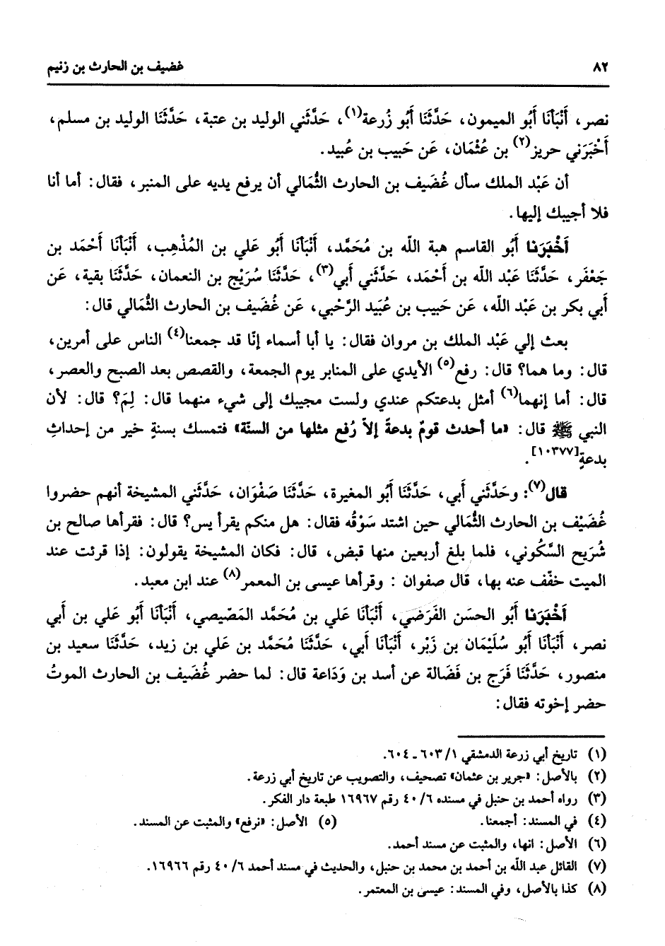 نصر أنبأنا أبو الميمون حدثنا أبو زرعة (1) حدثني الوليد بن عتبة حدثنا الوليد بن مسلم أخبرني حريز (2) بن عثمان عن حبيب بن عبيد أن عبد الملك سأل غضيف بن الحارث الثمالي أن يرفع يديه على المنبر فقال أما أنا فلا أجيبك إليها أخبرنا أبو القاسم هبة الله بن محمد أنبانا أبو علي بن المذهب أنبأنا أحمد بن جعفر حدثنا عبد الله بن أحمد حدثني أبي (3) حدثنا سريج بن النعمان حدثنا بقية عن أبي بكر بن عبد الله عن حبيب بن عبيد الرحبي عن غضيف بن الحارث الثمالي قال بعث إلي عبد الملك بن مروان فقال يا أبا أسماء إنا قد جمعنا (4) الناس على أمرين قال وما هما قال رفع (5) الأيدي على المنابر يوم الجمعة والقصص بعد الصبح والعصر قال أما إنهما (6) أمثل بدعتكم عندي ولست مجيبك إلى شئ منهما قال لم قال لأن النبي (صلى الله عليه وسلم) قال (ما أحدث قوم بدعة إلا رفع مثلها من السنة) فتمسك بسنة خير من إحداث بدعة قال (7) وحدثني أبي حدثنا أبو المغيرة حدثنا صفوان حدثني المشيخة أنهم حضروا غضيف بن الحارث الثمالي حين اشتد سوقه فقال هل منكم يقرأ يس قال فقرأها صالح بن شريح السكوني فلما بلغ أربعين منها قبض قال فكان المشيخة يقولون إذا قرأت عند الميت خفف عنه بها قال صفوان وقرأها عيسى بن المعمر (8) عند ابن معبد أخبرنا أبو الحسن الفرضي أنبأنا علي بن محمد المصيصي أنبأنا أبو علي بن أبي نصر أنبأنا أبو سليمان بن زبر أنبأنا أبي حدثنا محمد بن علي بن زيد حدثنا سعيد بن منصور حدثنا فرج بن فضالة عن أسد بن وداعة قال لما حضر غضيف بن الحارث الموت حضر إخوته فقال