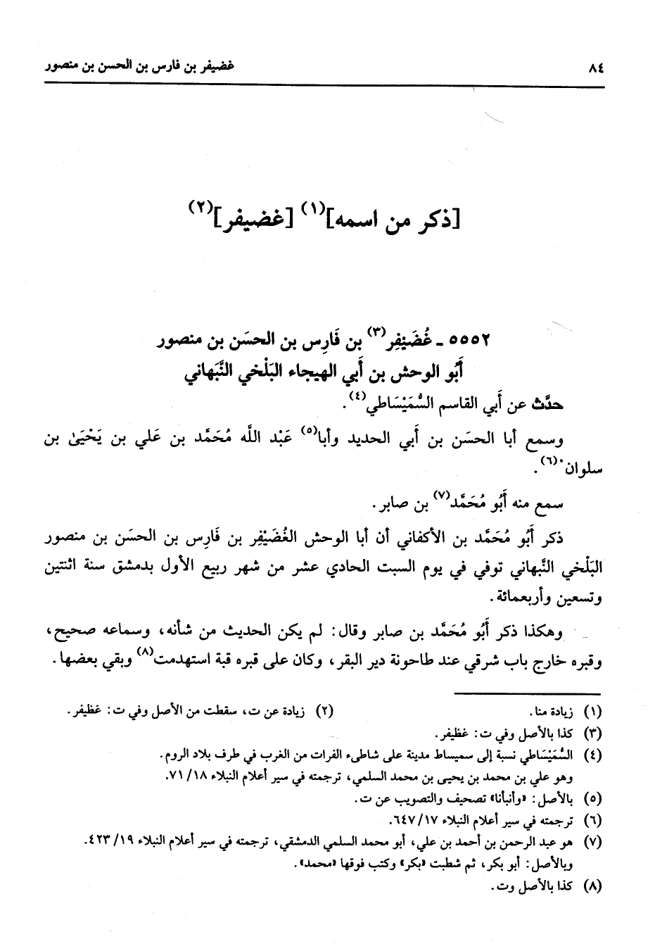 5552 - غضيفر (3) بن فارس بن الحسن بن منصور أبو الوحش بن أبي الهيجاء البلخي ال نبهاني حدث عن أبي القاسم السميساطي (4) وسمع أبا الحسن بن أبي الحديد وأبا (5) عبد الله محمد بن علي بن يحيى بن سلوان (6) سمع منه أبو محمد (7) بن صابر ذكر أبو محمد بن الأكفاني أن أبا الوحش الغضيفر بن فارس بن الحسن بن منصور البلخي النبهاني توفي في يوم السبت الحادي عشر من شهر ربيع الأول بدمشق سنة اثنتين وتسعين وأربعمائة وهكذا ذكر أبو محمد بن صابر وقال لم يكن الحديث من شأنه وسماعه صحيح وقبره خارج باب شرقي عند طاحونة دير البقر وكان عليقبره قبة استهدمت (8) وبقي بعضها "
